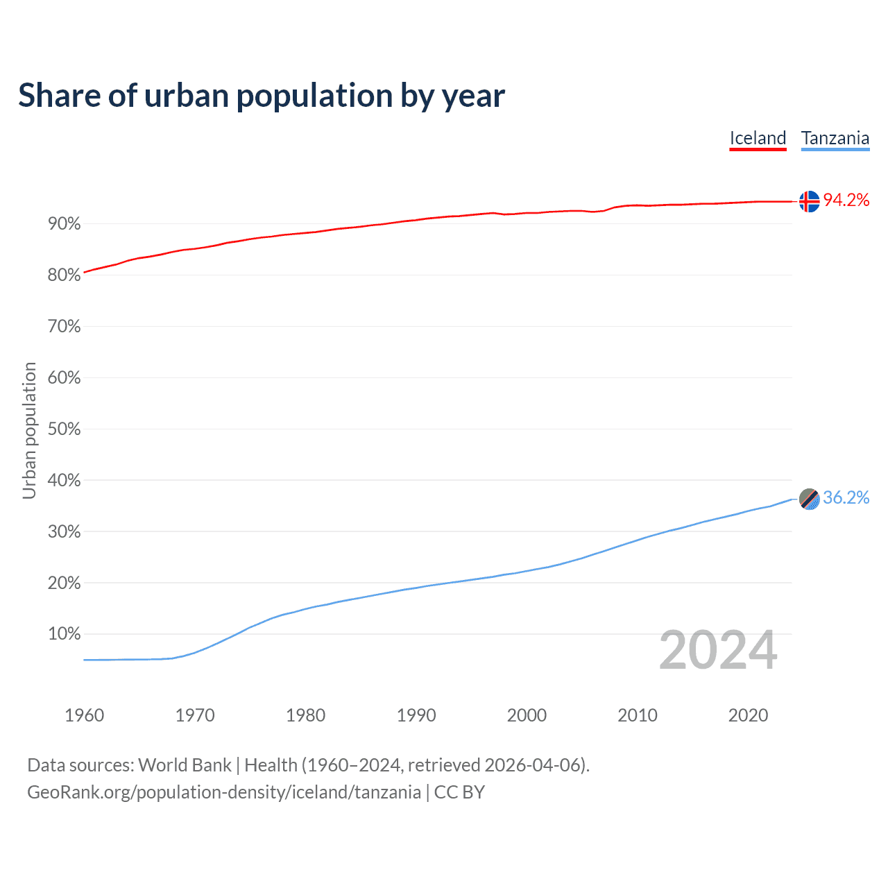 From 2004 to 2024, the share of urban population changed from 92.4% to 94.2% in Iceland and from 24.1% to 36.2% in Tanzania.