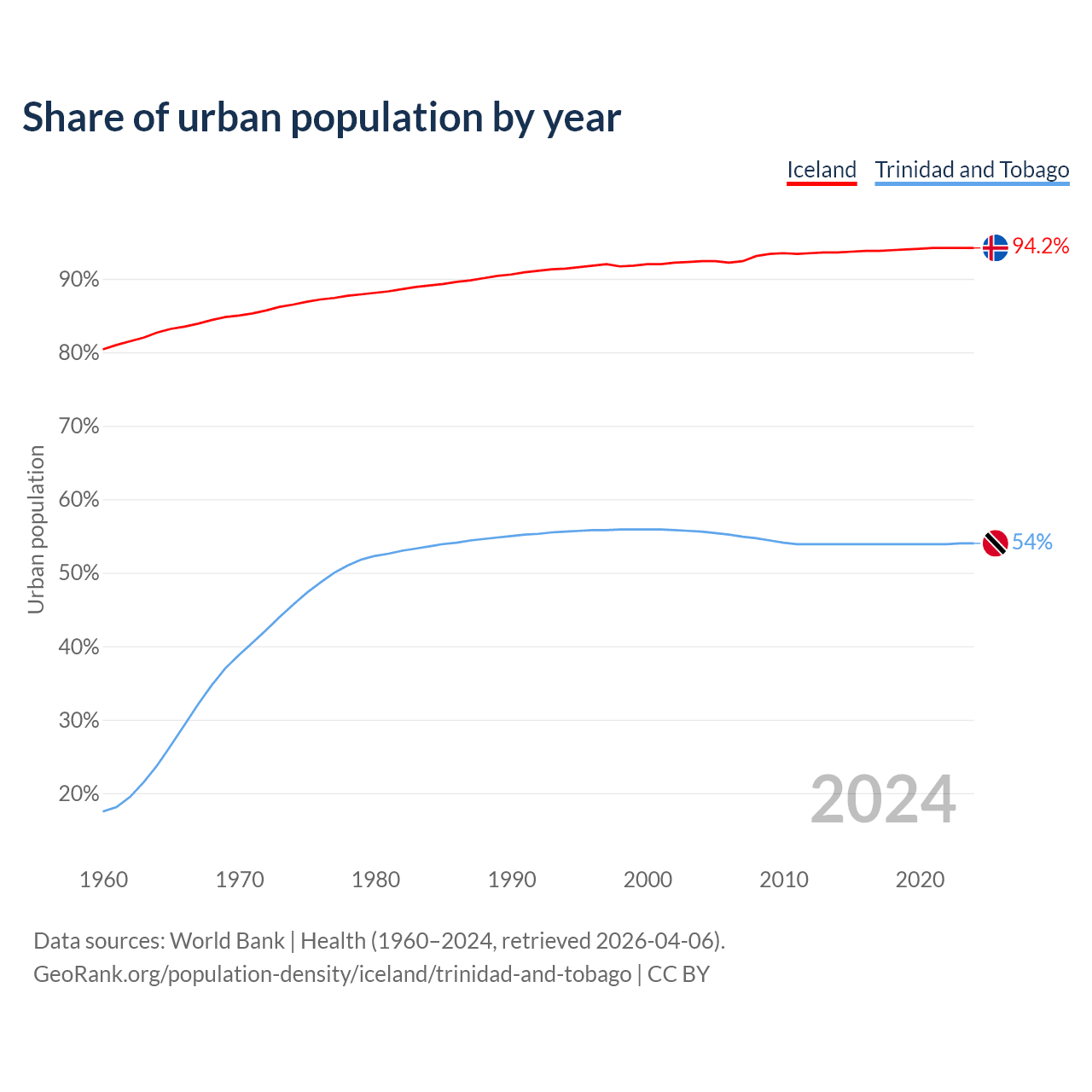 From 2004 to 2024, the share of urban population changed from 92.4% to 94.2% in Iceland and from 55.6% to 54% in Trinidad and Tobago.