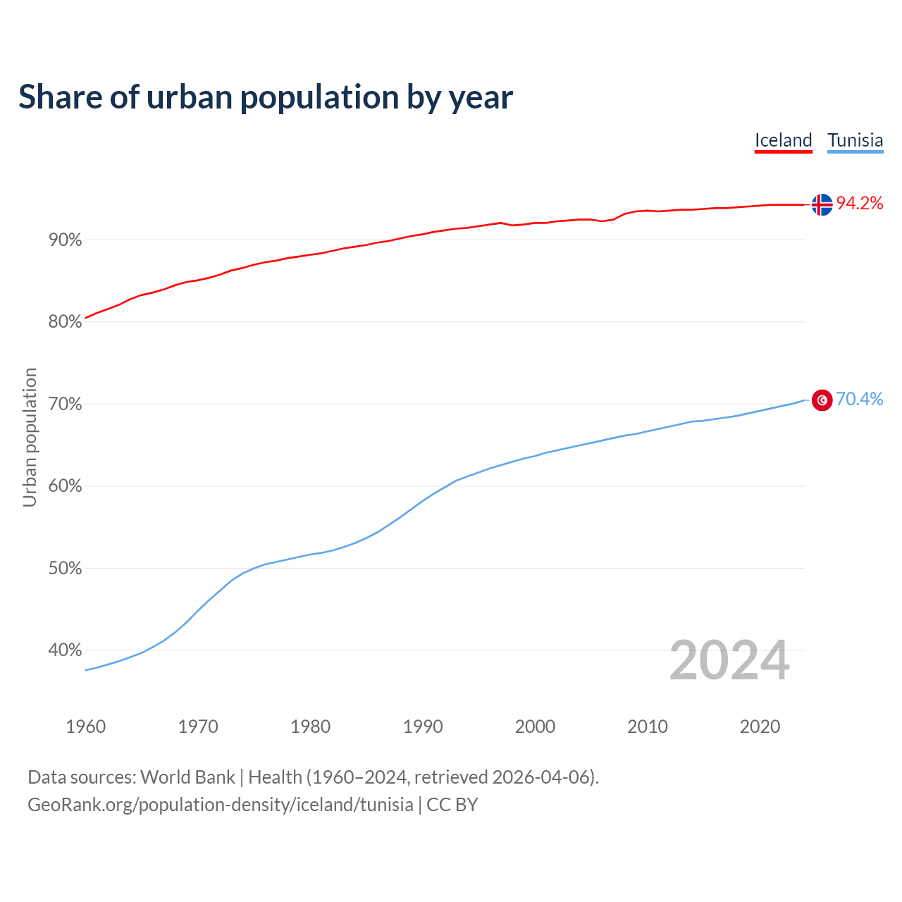From 2004 to 2024, the share of urban population changed from 92.4% to 94.2% in Iceland and from 64.9% to 70.4% in Tunisia.