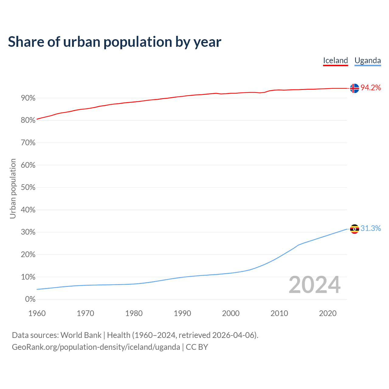 From 2004 to 2024, the share of urban population changed from 92.4% to 94.2% in Iceland and from 13.1% to 31.3% in Uganda.