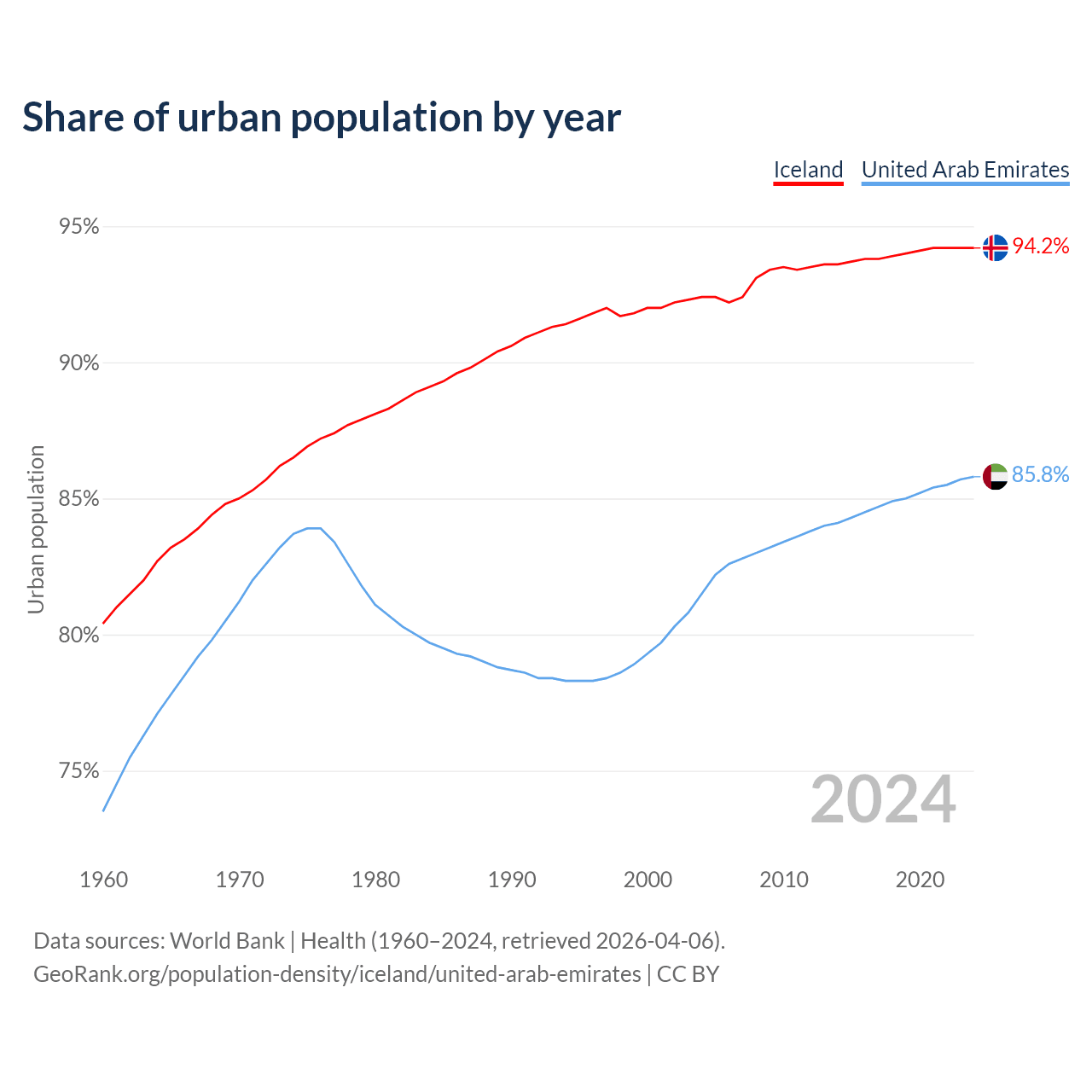 From 2004 to 2024, the share of urban population changed from 92.4% to 94.2% in Iceland and from 81.5% to 85.8% in the United Arab Emirates.