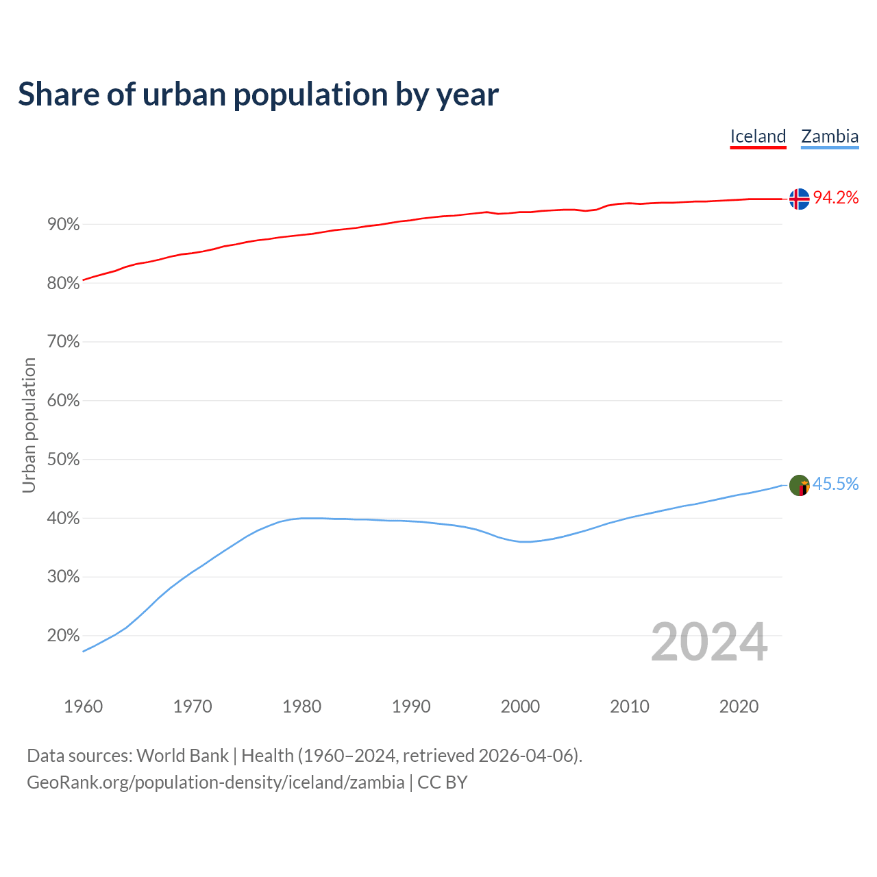 From 2004 to 2024, the share of urban population changed from 92.4% to 94.2% in Iceland and from 36.8% to 45.5% in Zambia.