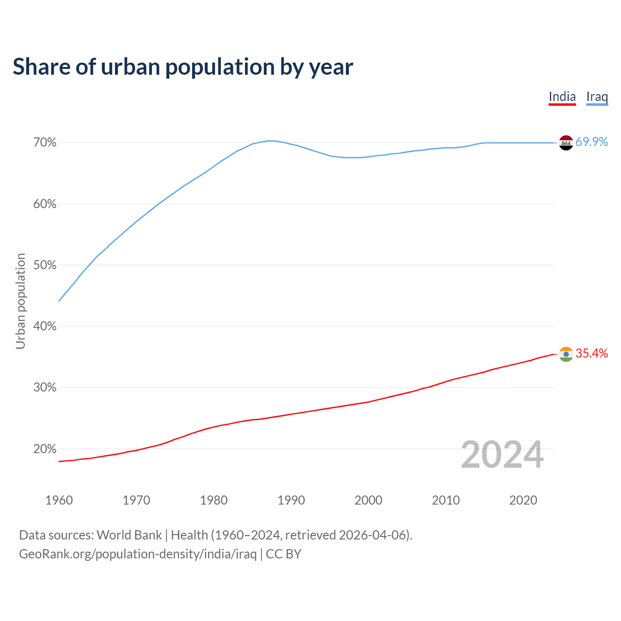 From 2004 to 2024, the share of urban population changed from 28.8% to 35.4% in India and from 68.2% to 69.9% in Iraq.