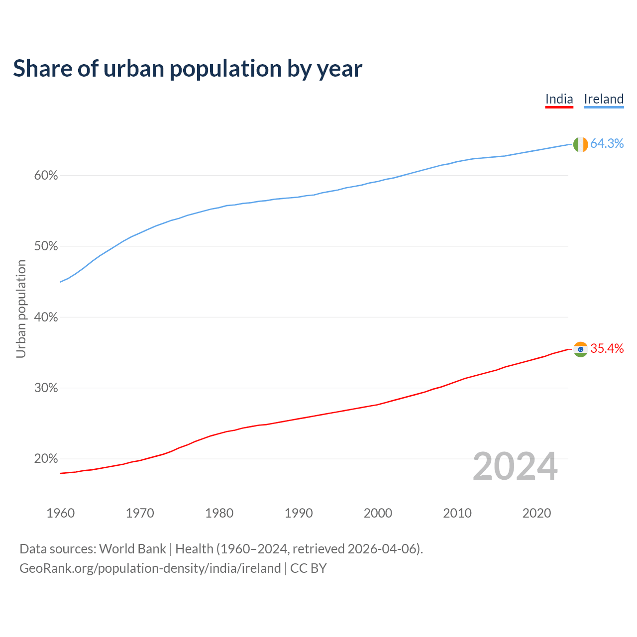 From 2004 to 2024, the share of urban population changed from 28.8% to 35.4% in India and from 60.2% to 64.3% in Ireland.