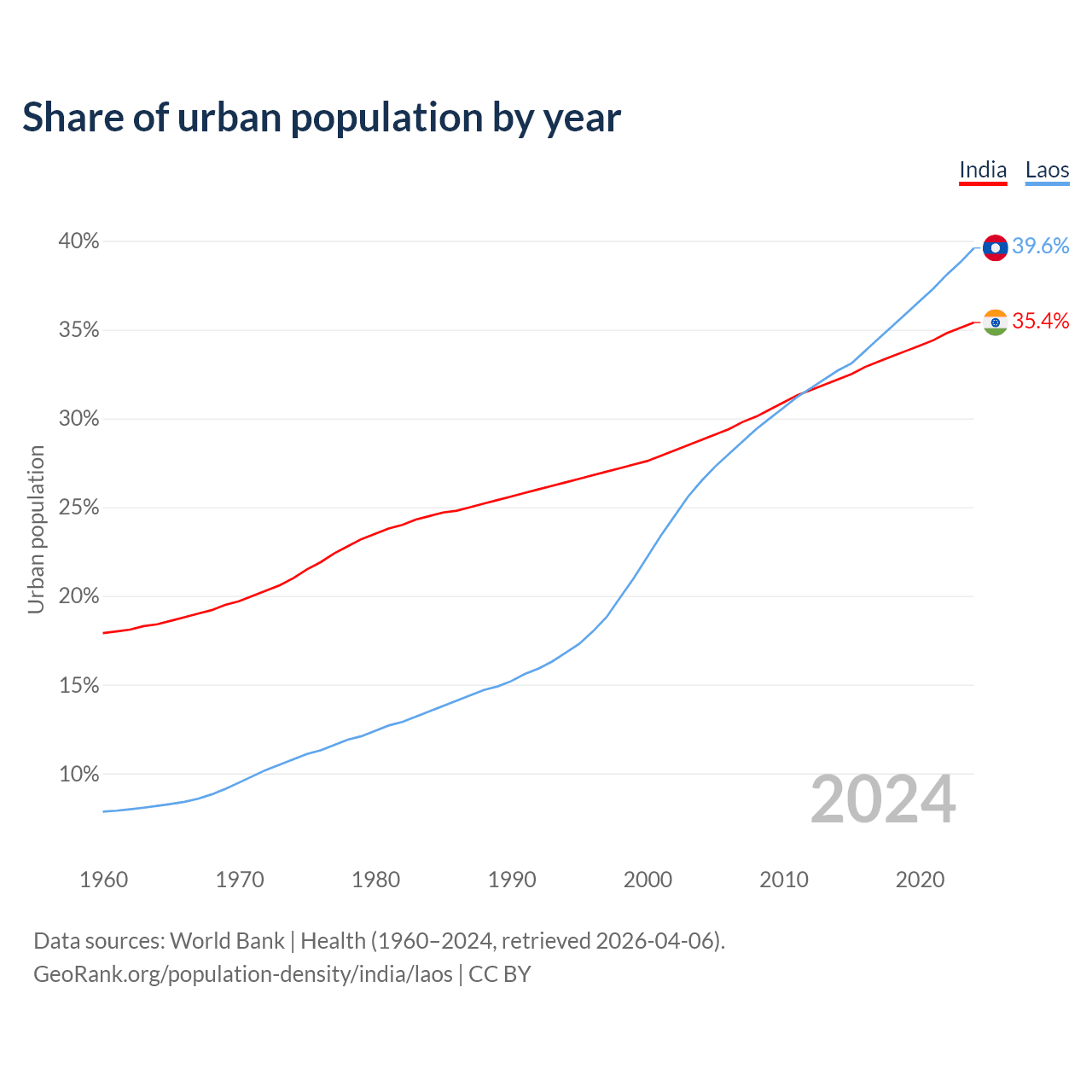 From 2004 to 2024, the share of urban population changed from 28.8% to 35.4% in India and from 26.5% to 39.6% in Laos.