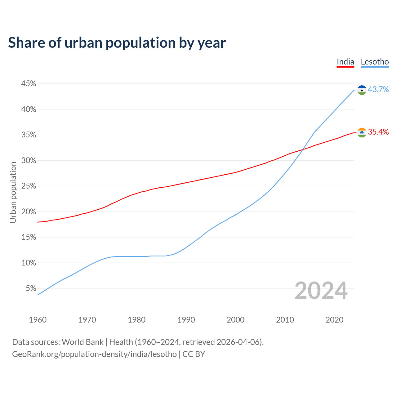 From 2004 to 2024, the share of urban population changed from 28.8% to 35.4% in India and from 21.8% to 43.7% in Lesotho.