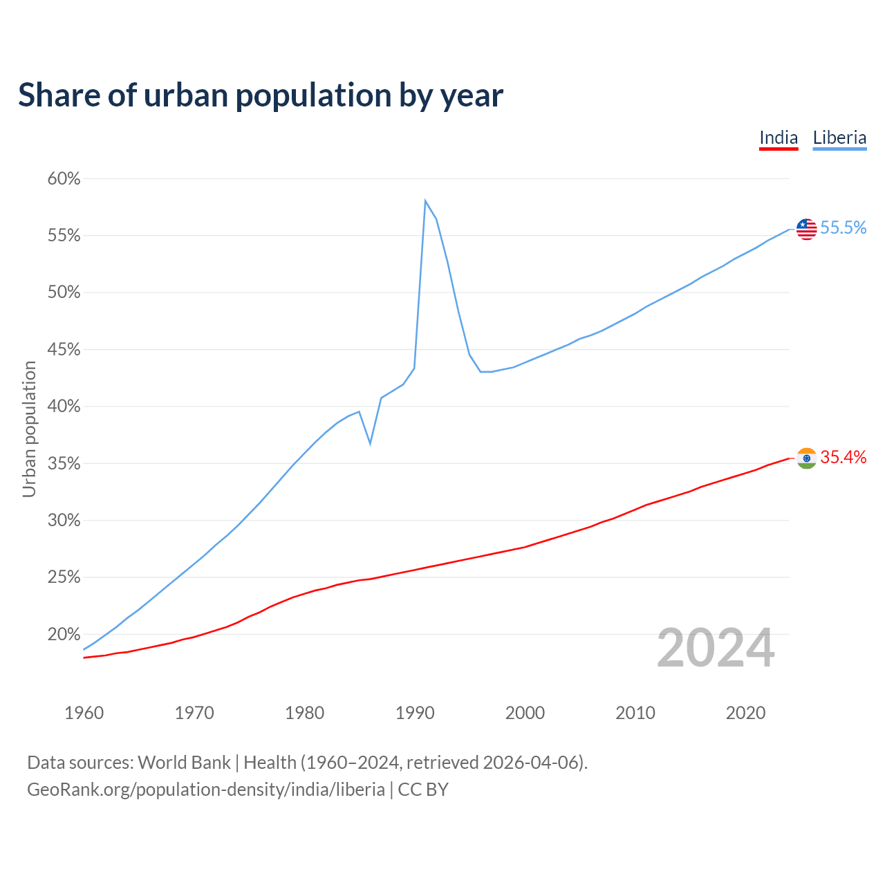 From 2004 to 2024, the share of urban population changed from 28.8% to 35.4% in India and from 45.4% to 55.5% in Liberia.