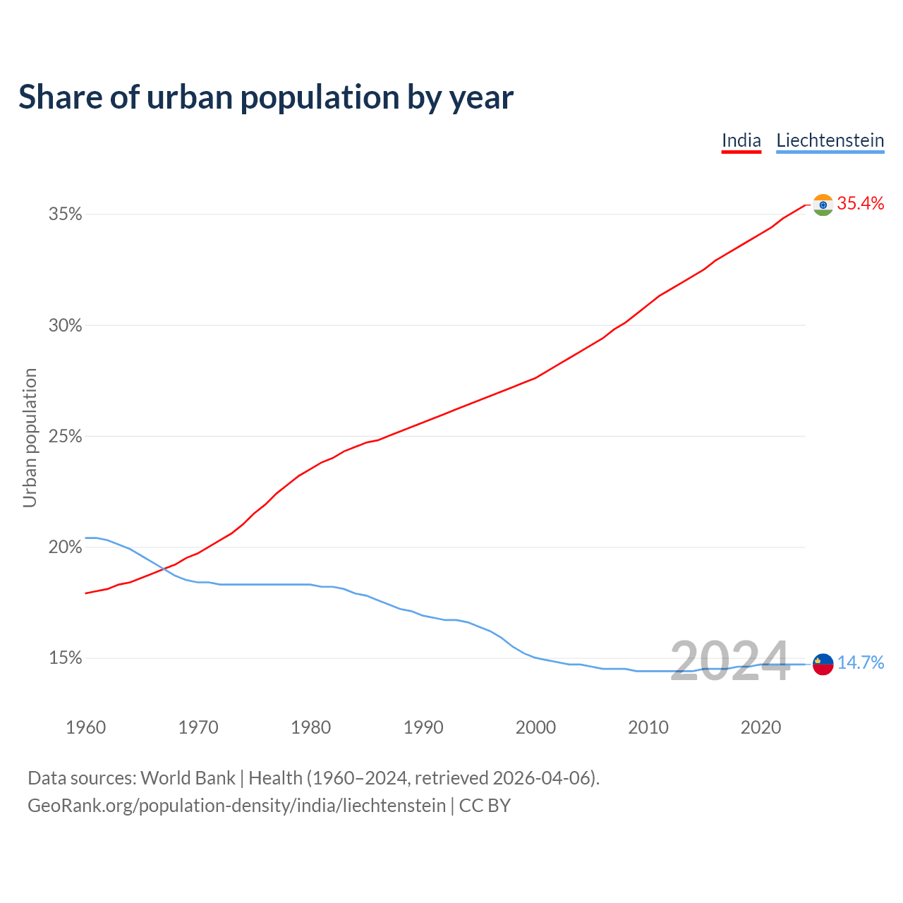 From 2004 to 2024, the share of urban population changed from 28.8% to 35.4% in India and from 14.7% to 14.7% in Liechtenstein.