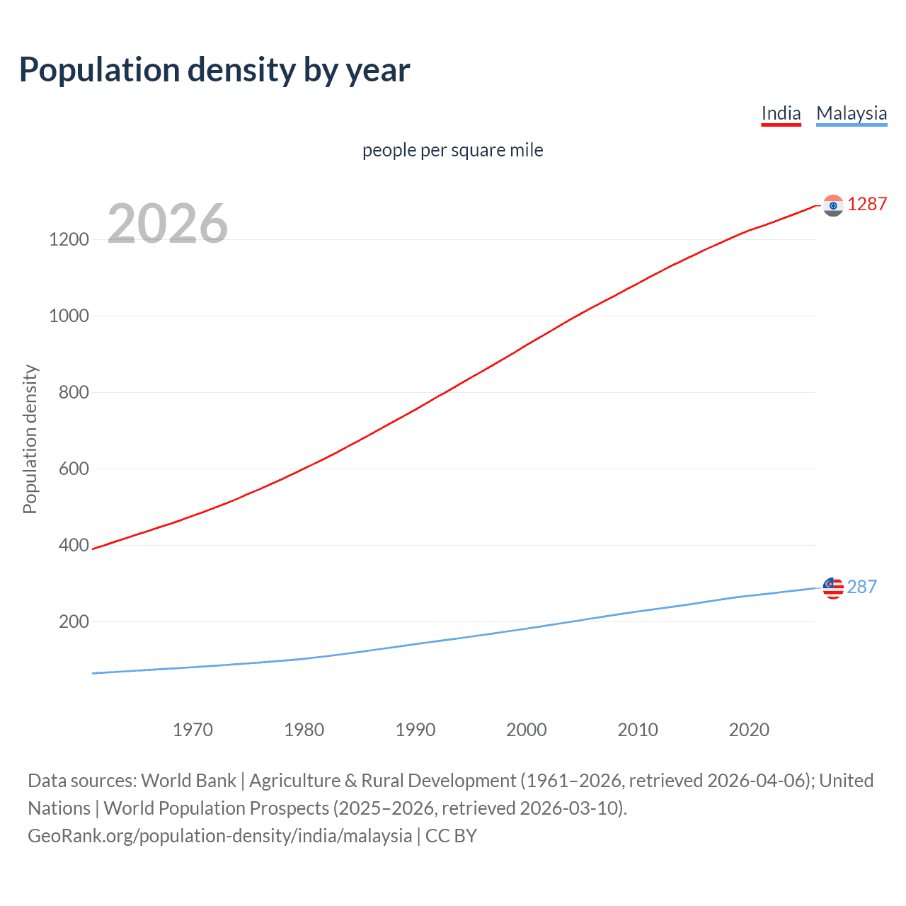 From 2006 to 2026, population density in India increased by 25.9%, compared to a 37.8% growth in Malaysia.
