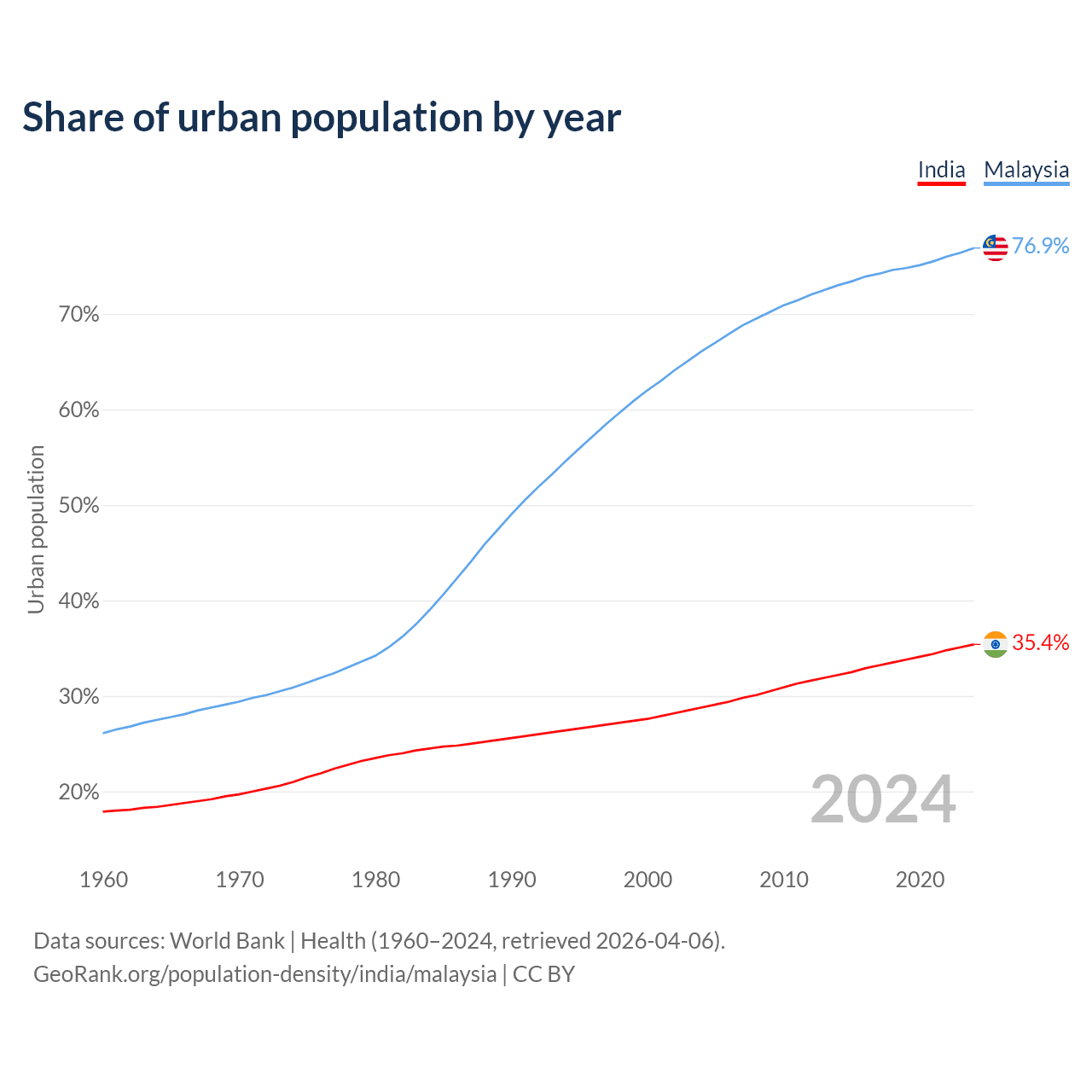 From 2004 to 2024, the share of urban population changed from 28.8% to 35.4% in India and from 66.1% to 76.9% in Malaysia.