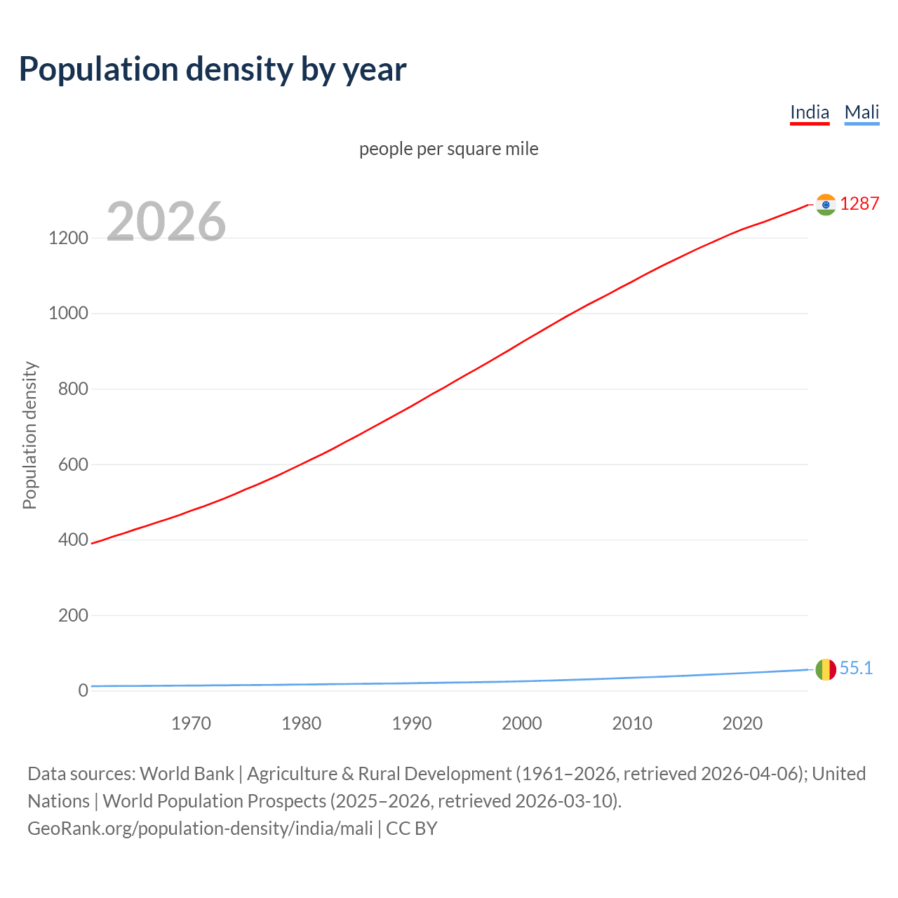 From 2006 to 2026, population density in India increased by 25.9%, compared to a 85.4% growth in Mali.