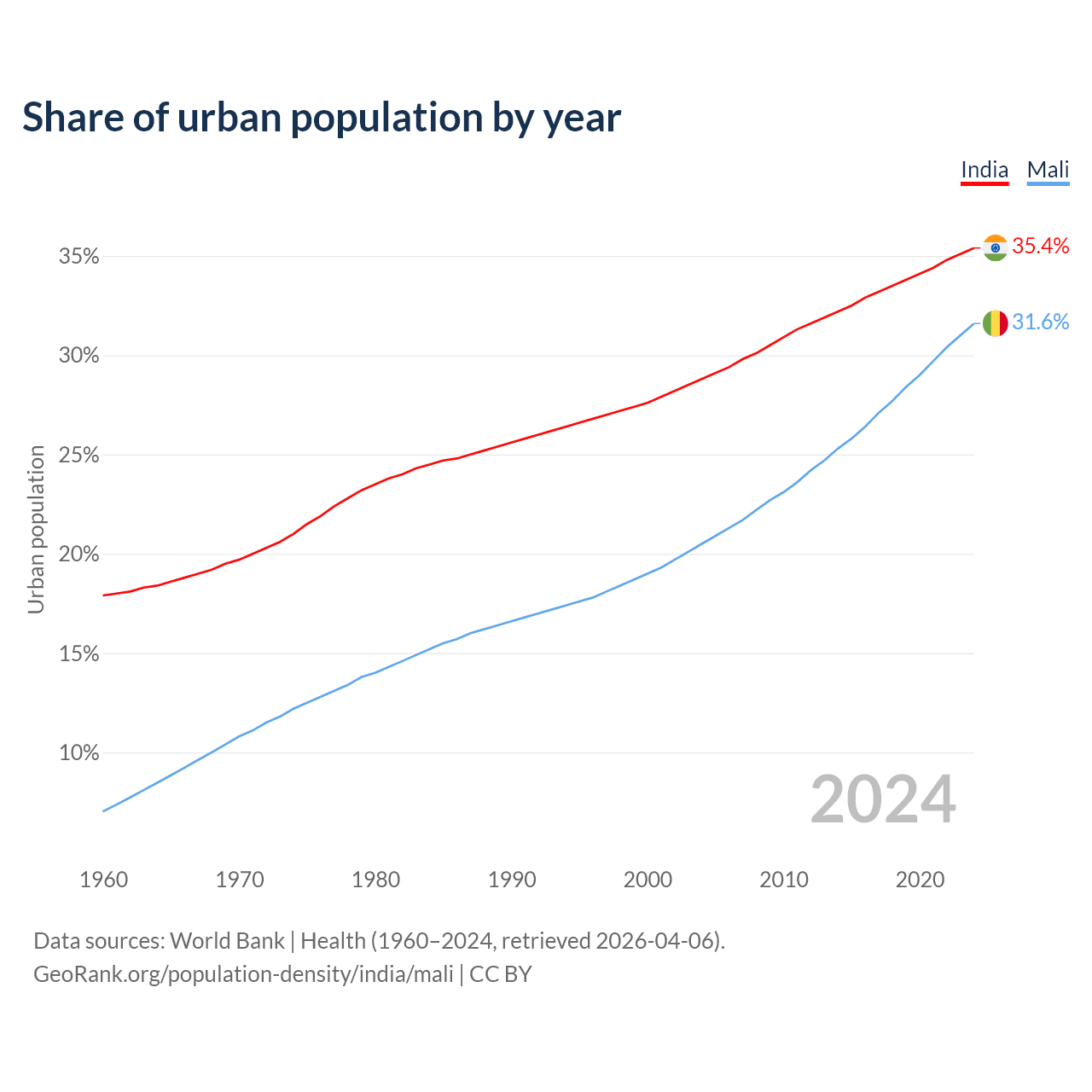From 2004 to 2024, the share of urban population changed from 28.8% to 35.4% in India and from 20.5% to 31.6% in Mali.