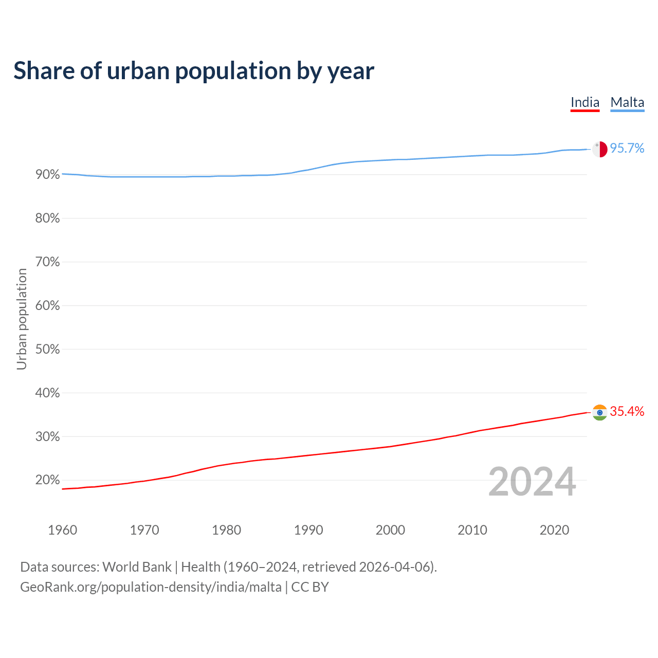 From 2004 to 2024, the share of urban population changed from 28.8% to 35.4% in India and from 93.6% to 95.7% in Malta.