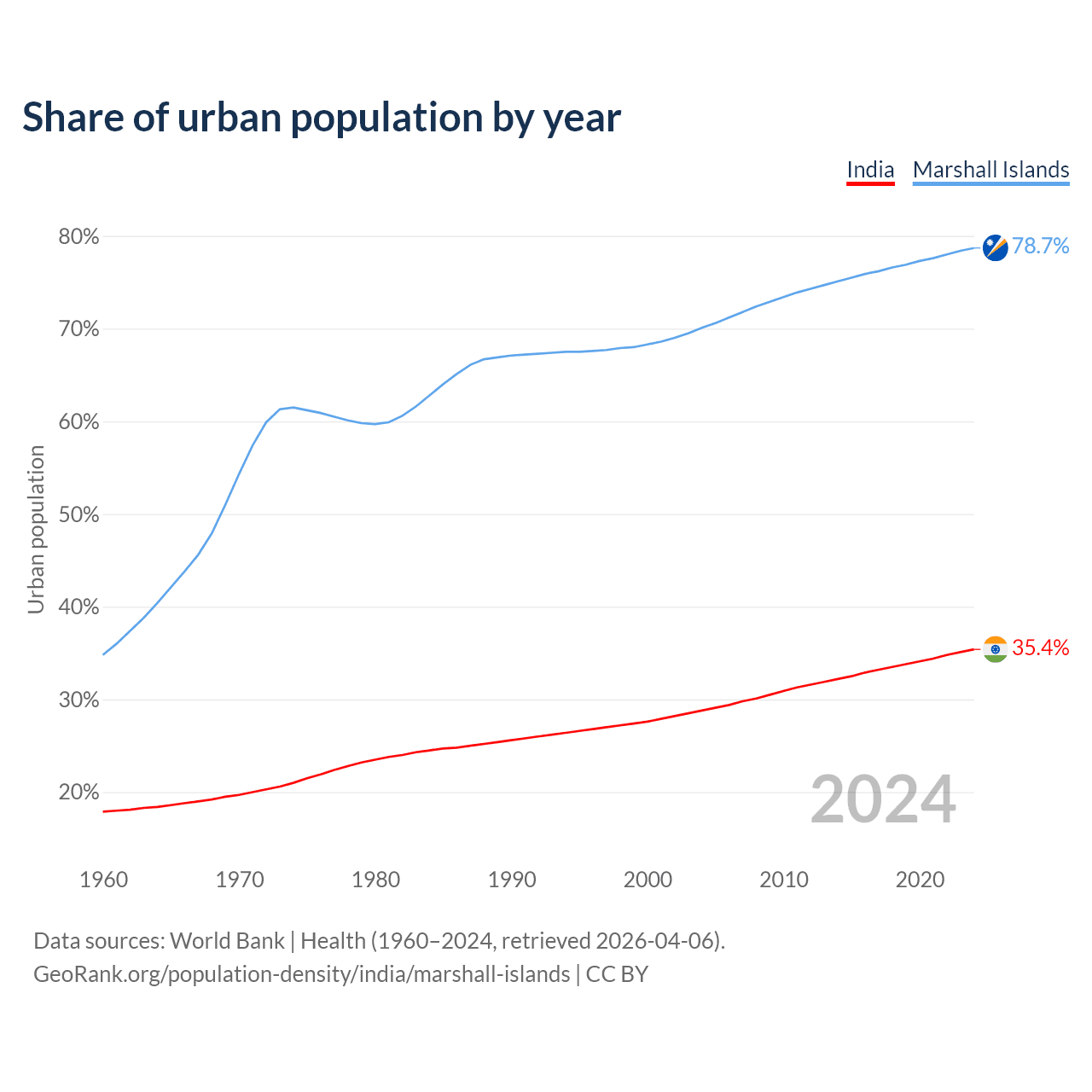 From 2004 to 2024, the share of urban population changed from 28.8% to 35.4% in India and from 70.1% to 78.7% in the Marshall Islands.