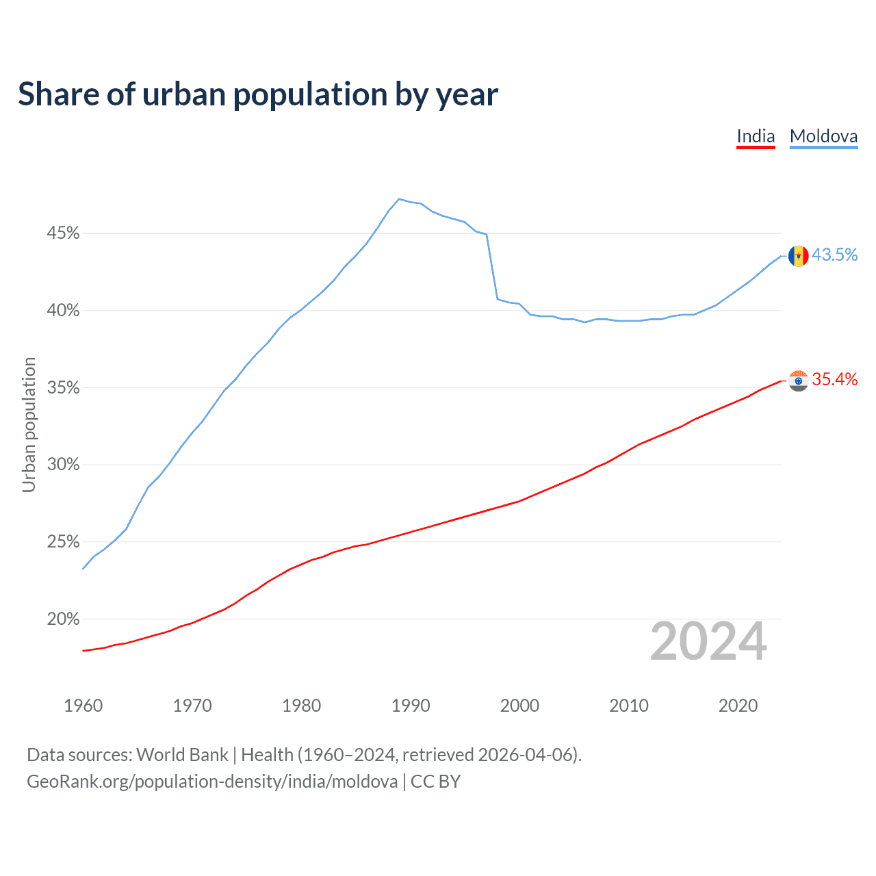 From 2004 to 2024, the share of urban population changed from 28.8% to 35.4% in India and from 39.4% to 43.5% in Moldova.