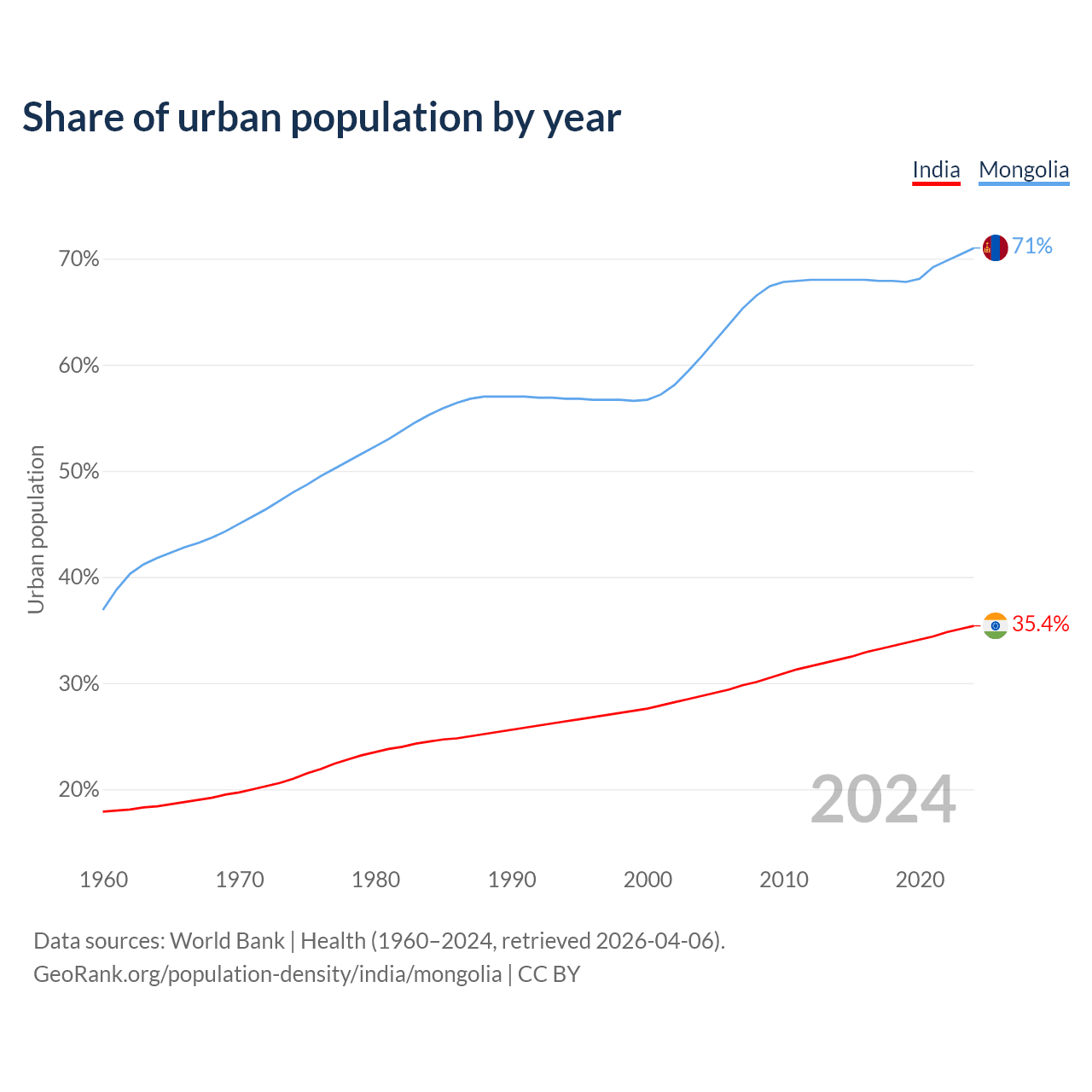 From 2004 to 2024, the share of urban population changed from 28.8% to 35.4% in India and from 60.8% to 71% in Mongolia.