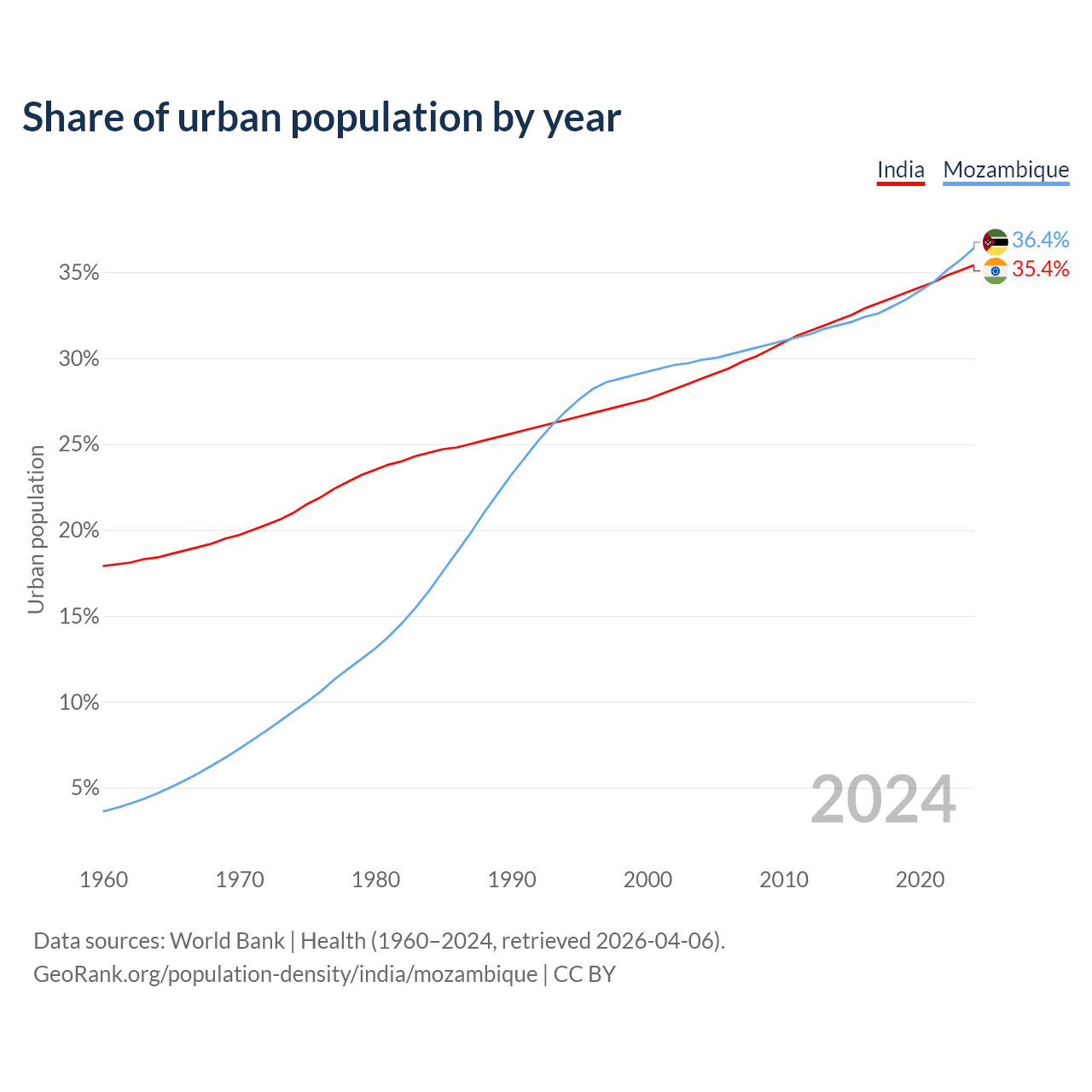 From 2004 to 2024, the share of urban population changed from 28.8% to 35.4% in India and from 29.9% to 36.4% in Mozambique.