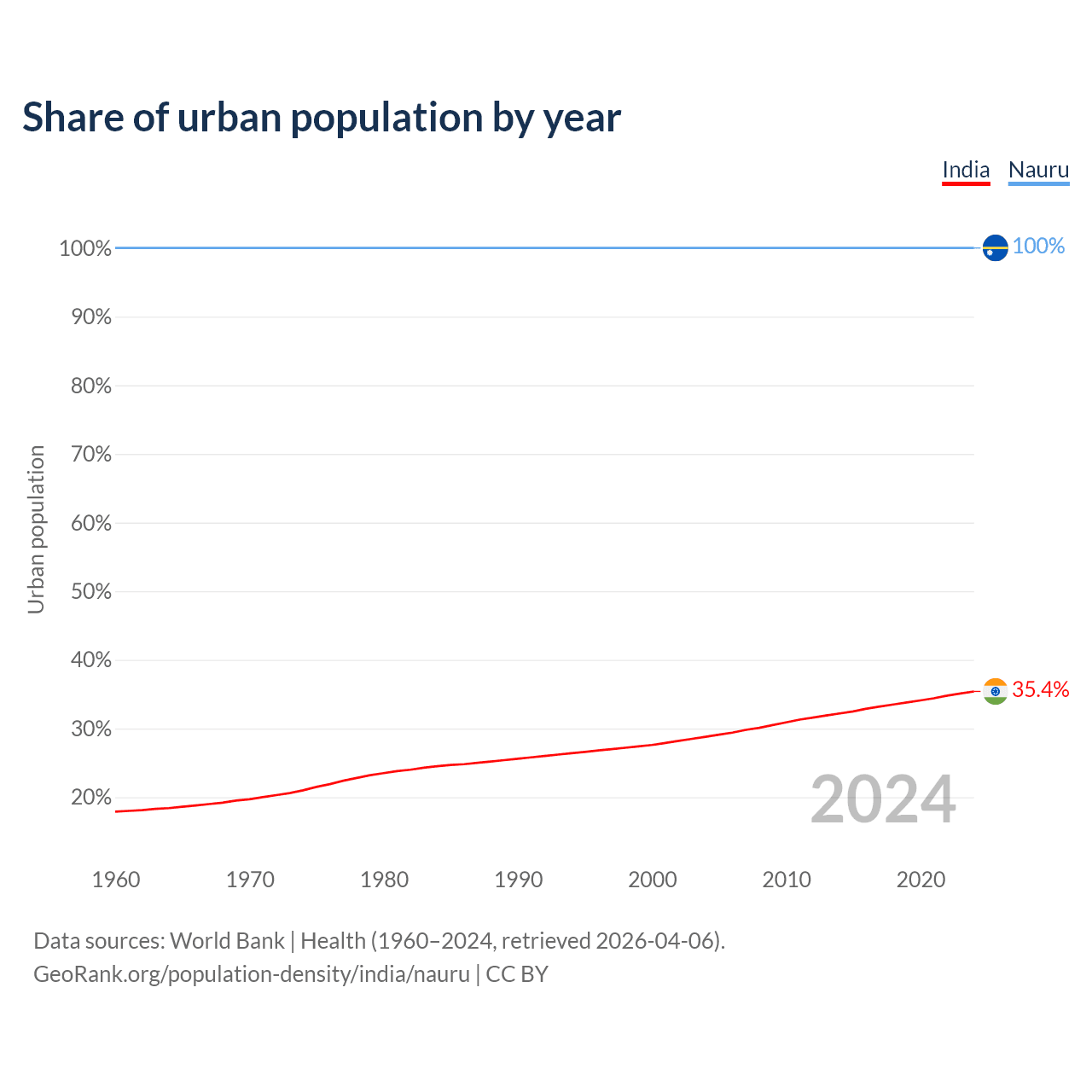 From 2004 to 2024, the share of urban population changed from 28.8% to 35.4% in India and from 100% to 100% in Nauru.