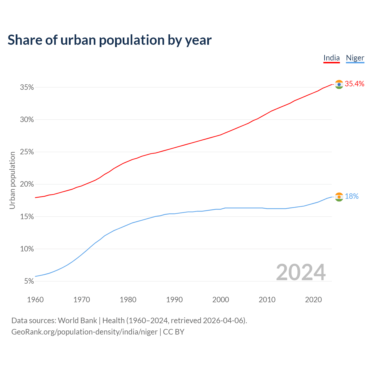 From 2004 to 2024, the share of urban population changed from 28.8% to 35.4% in India and from 16.3% to 18% in Niger.