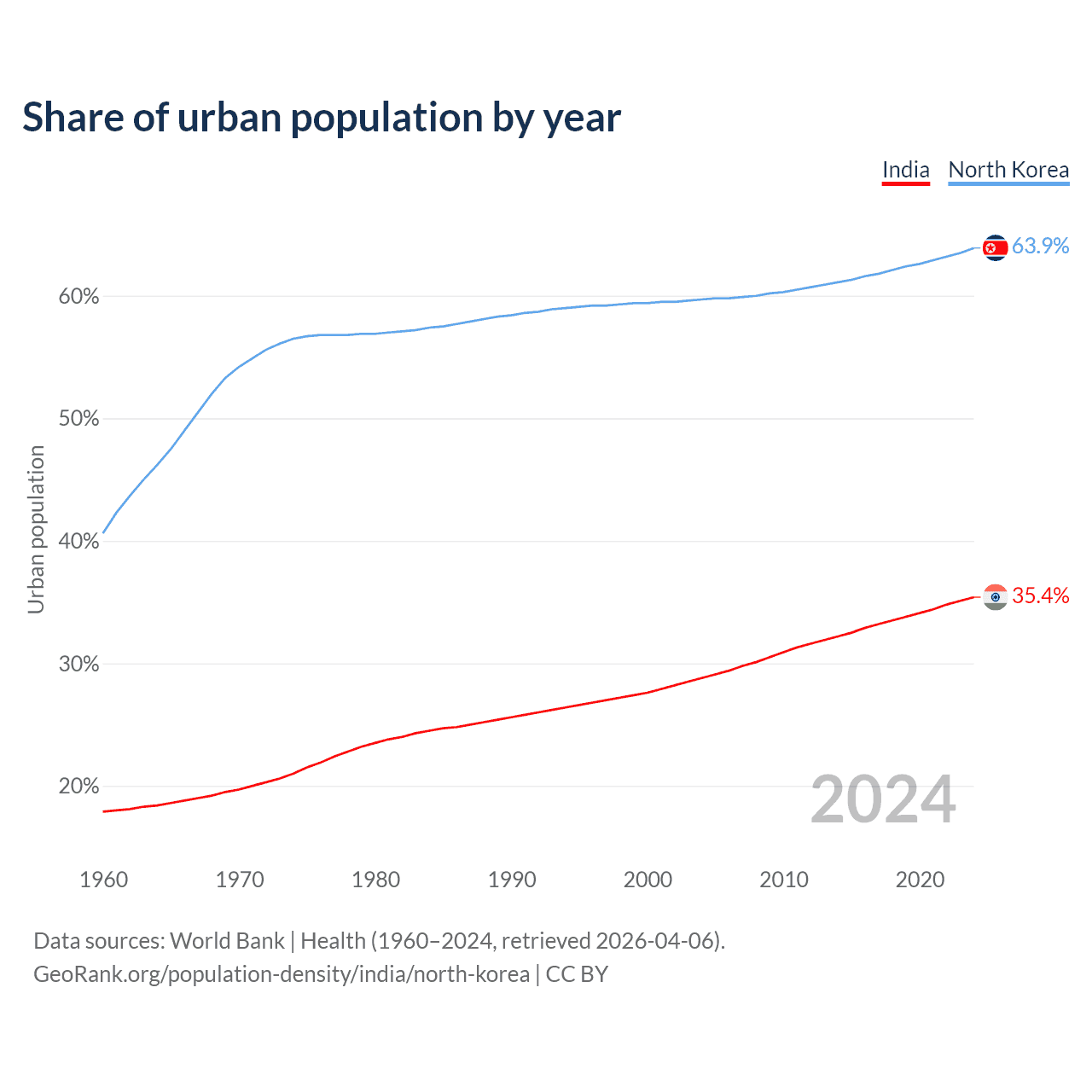 From 2004 to 2024, the share of urban population changed from 28.8% to 35.4% in India and from 59.7% to 63.9% in North Korea.