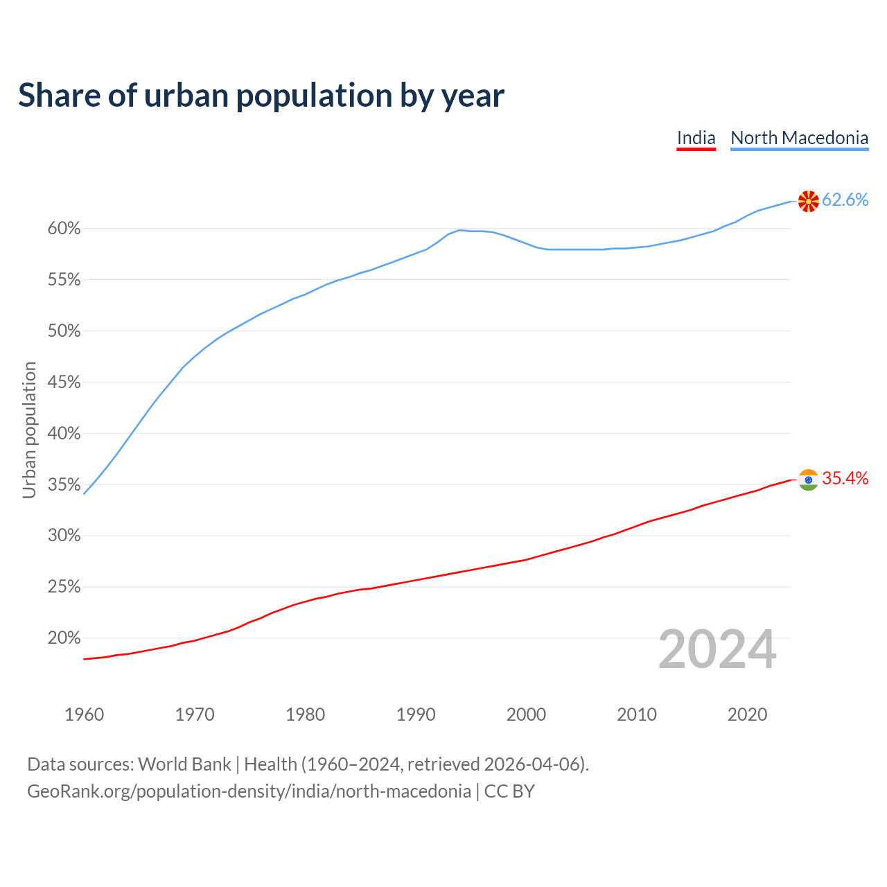 From 2004 to 2024, the share of urban population changed from 28.8% to 35.4% in India and from 57.9% to 62.6% in North Macedonia.