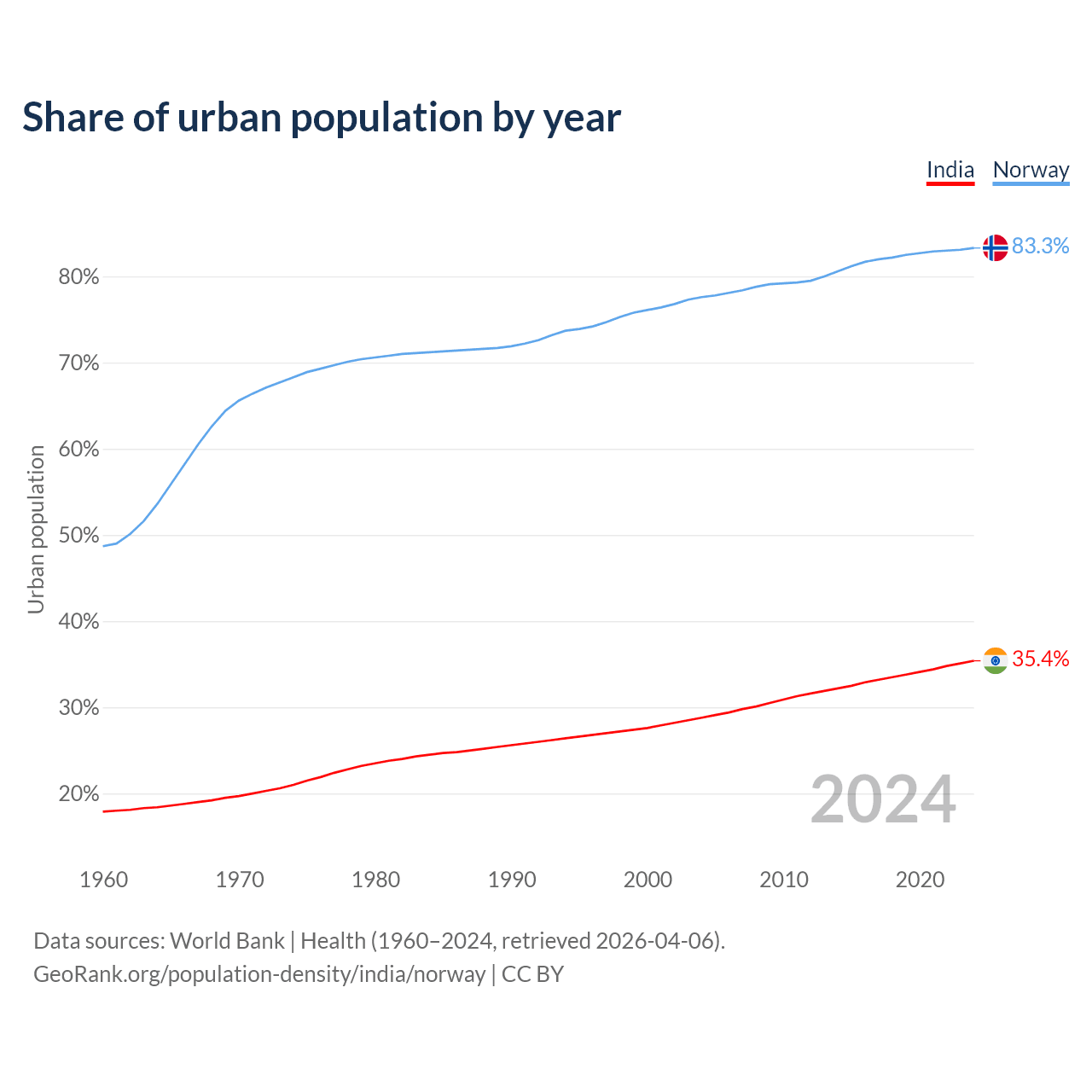 From 2004 to 2024, the share of urban population changed from 28.8% to 35.4% in India and from 77.6% to 83.3% in Norway.