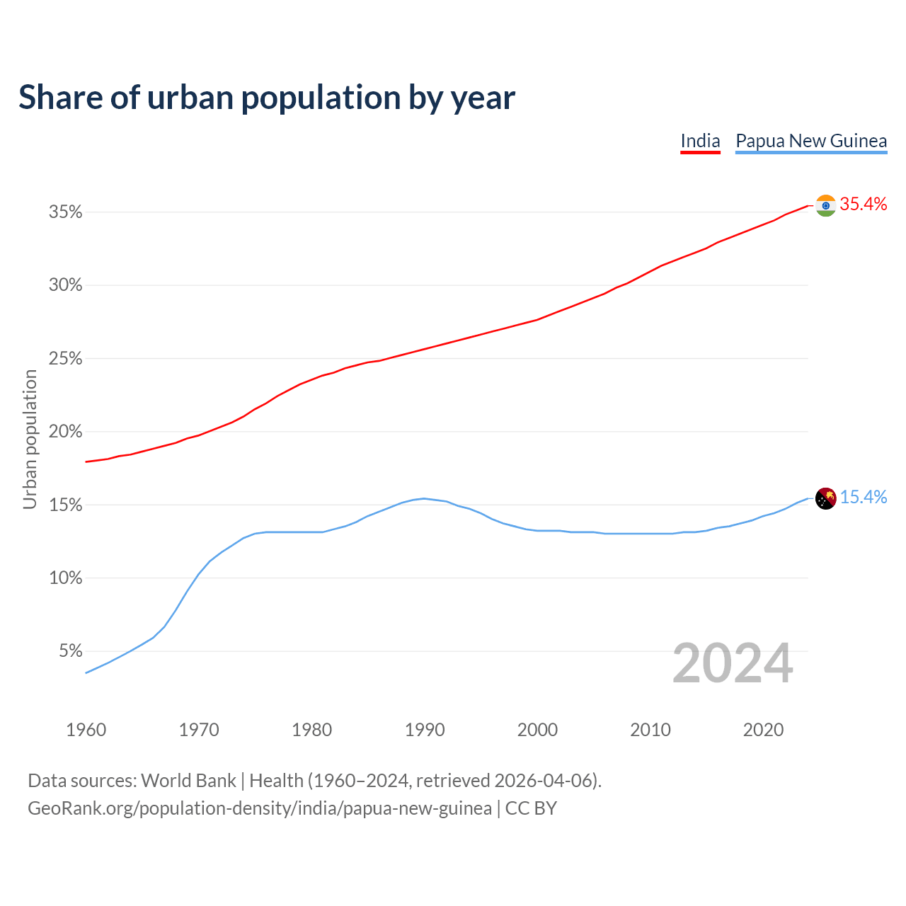 From 2004 to 2024, the share of urban population changed from 28.8% to 35.4% in India and from 13.1% to 15.4% in Papua New Guinea.