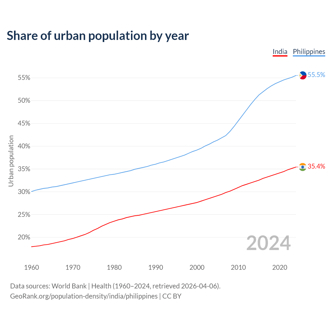 From 2004 to 2024, the share of urban population changed from 28.8% to 35.4% in India and from 40.9% to 55.5% in the Philippines.