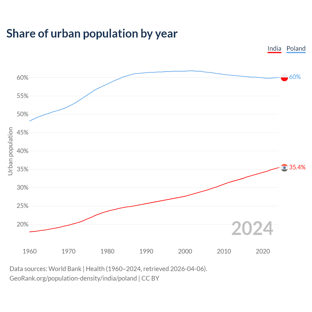 From 2004 to 2024, the share of urban population changed from 28.8% to 35.4% in India and from 61.7% to 60% in Poland.