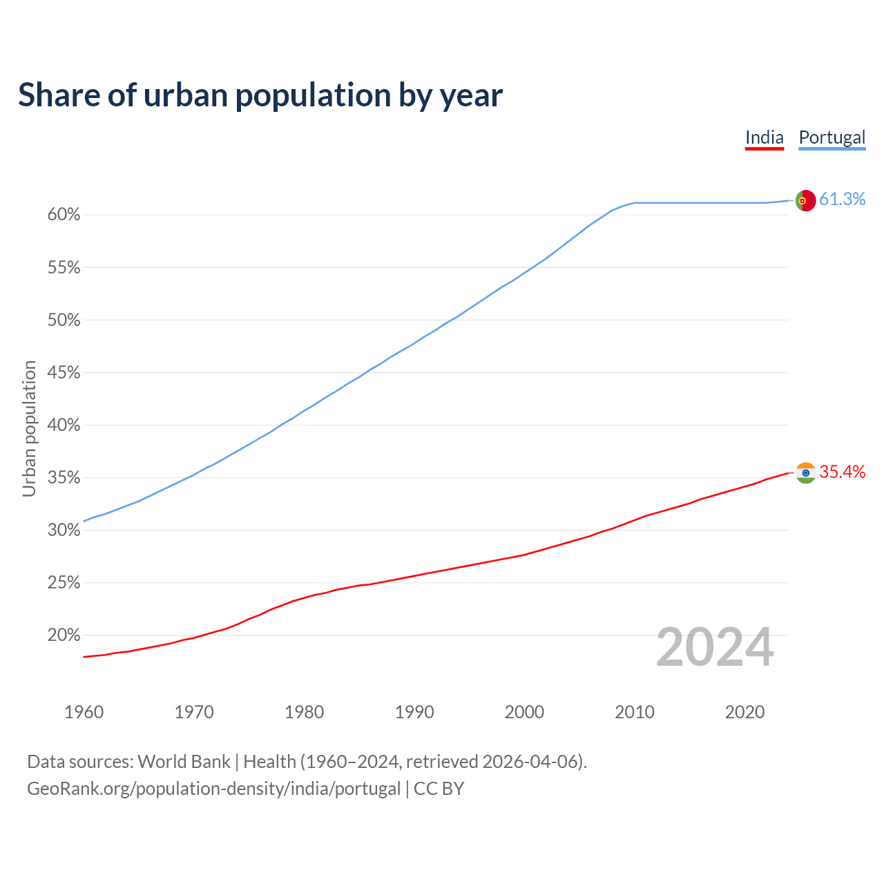 From 2004 to 2024, the share of urban population changed from 28.8% to 35.4% in India and from 57.4% to 61.3% in Portugal.