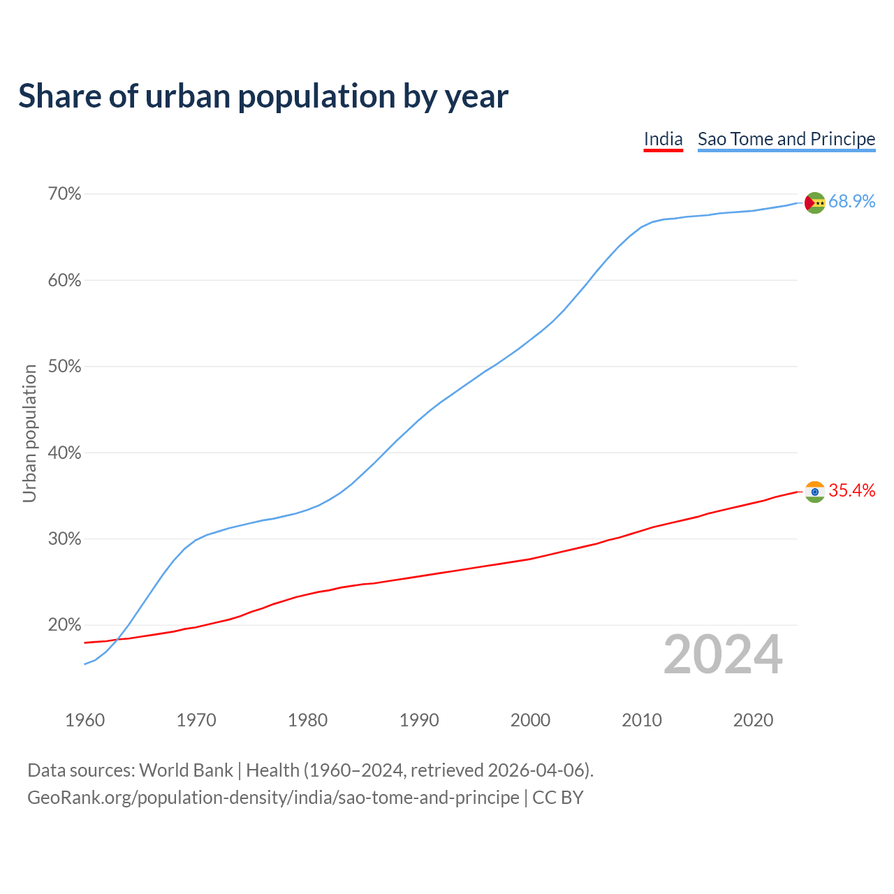 From 2004 to 2024, the share of urban population changed from 28.8% to 35.4% in India and from 57.9% to 68.9% in Sao Tome and Principe.