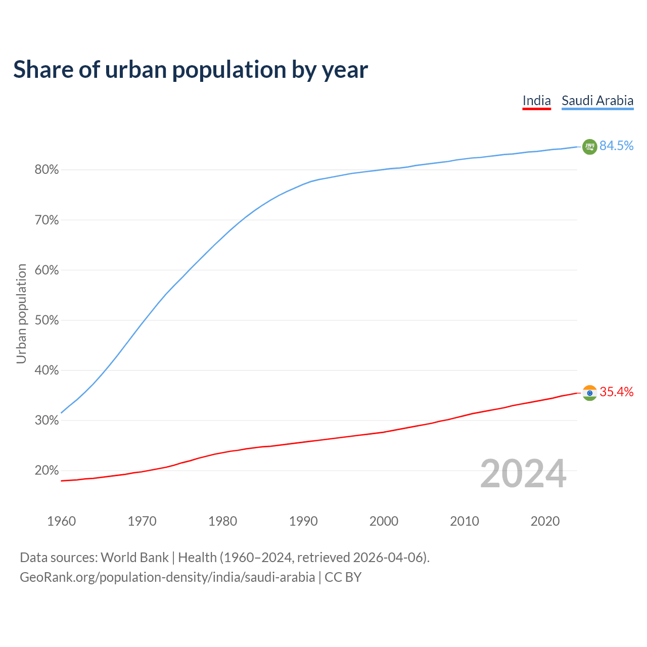 From 2004 to 2024, the share of urban population changed from 28.8% to 35.4% in India and from 80.8% to 84.5% in Saudi Arabia.