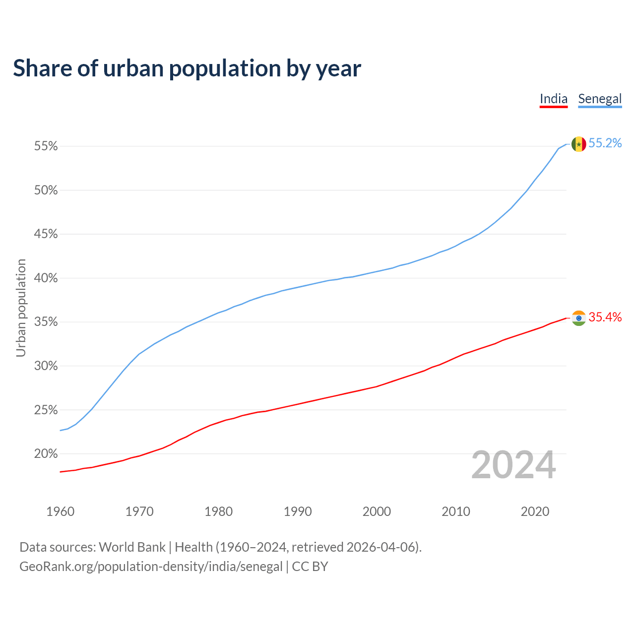 From 2004 to 2024, the share of urban population changed from 28.8% to 35.4% in India and from 41.6% to 55.2% in Senegal.
