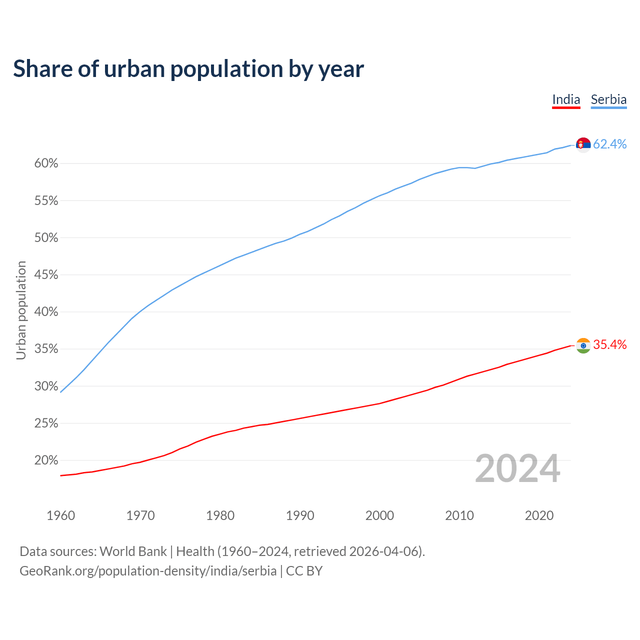 From 2004 to 2024, the share of urban population changed from 28.8% to 35.4% in India and from 57.3% to 62.4% in Serbia.