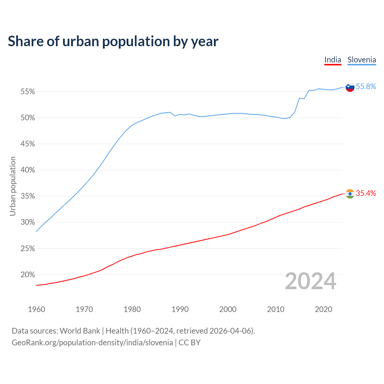 From 2004 to 2024, the share of urban population changed from 28.8% to 35.4% in India and from 50.7% to 55.8% in Slovenia.