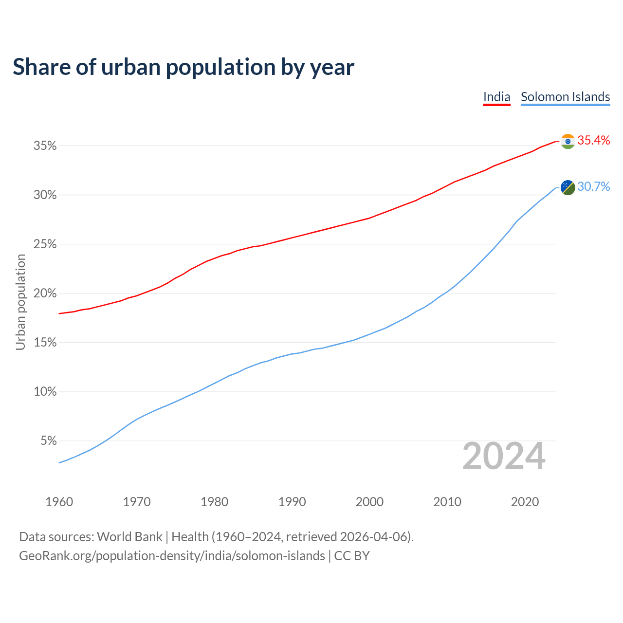 From 2004 to 2024, the share of urban population changed from 28.8% to 35.4% in India and from 17.2% to 30.7% in the Solomon Islands.