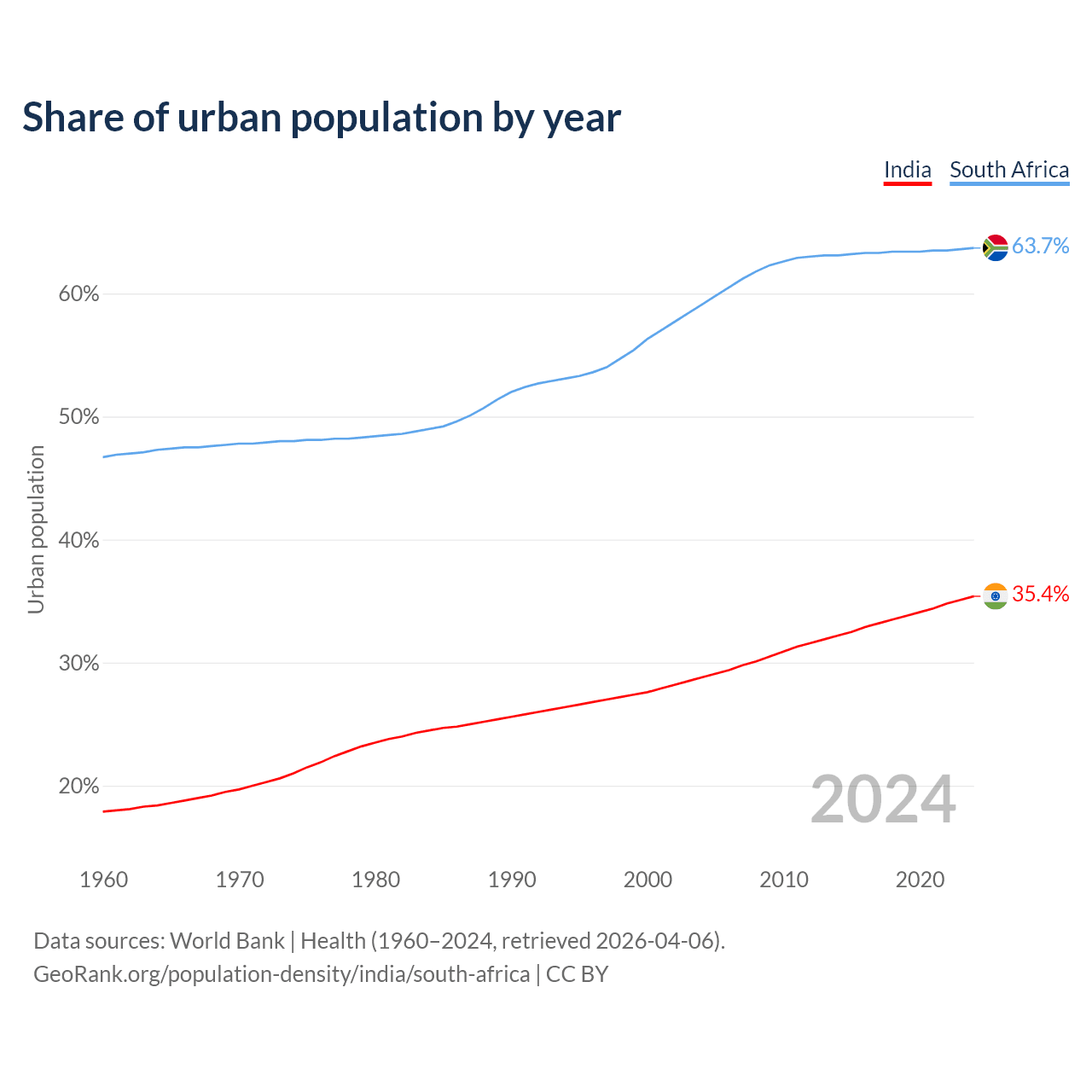 From 2004 to 2024, the share of urban population changed from 28.8% to 35.4% in India and from 59.1% to 63.7% in South Africa.