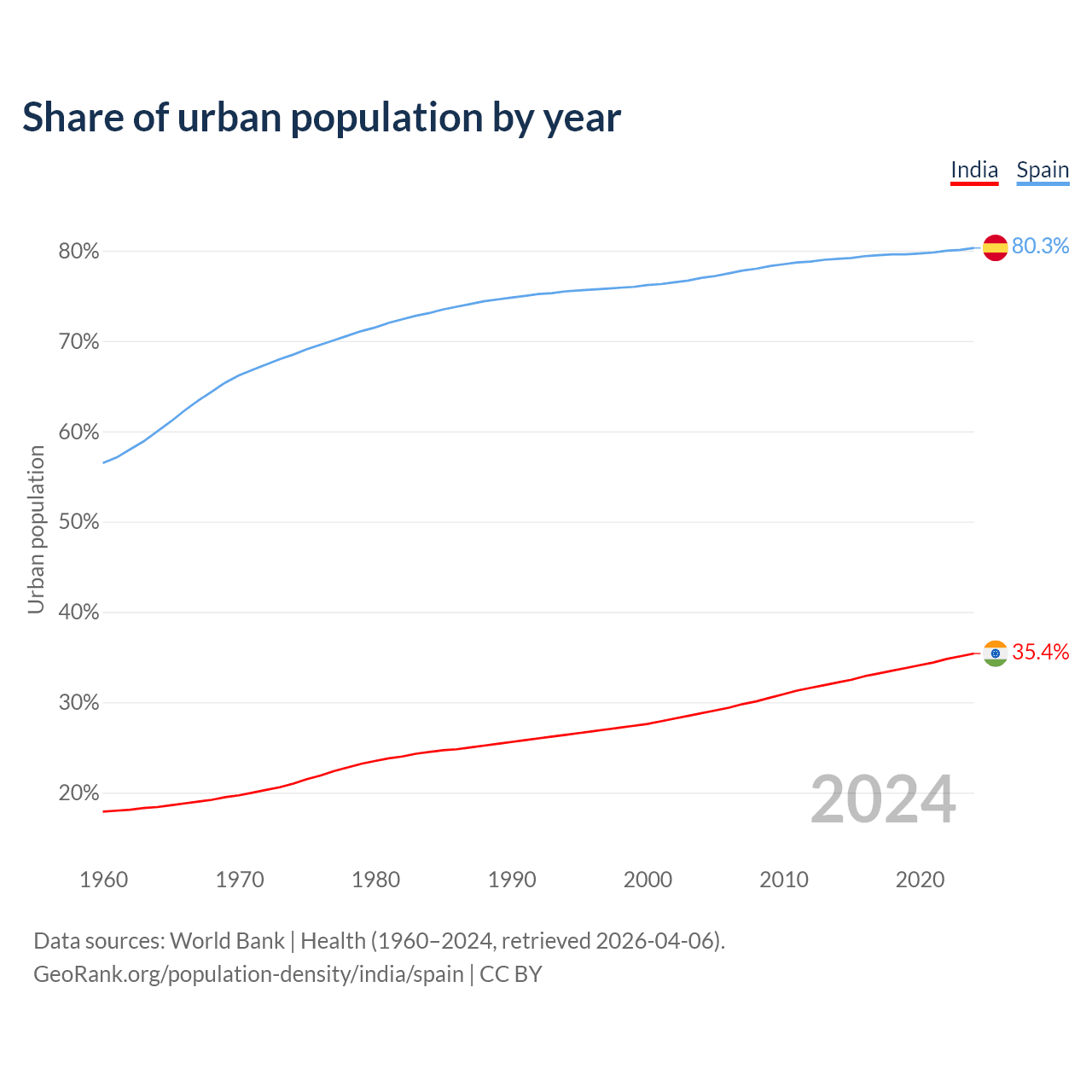 From 2004 to 2024, the share of urban population changed from 28.8% to 35.4% in India and from 77% to 80.3% in Spain.