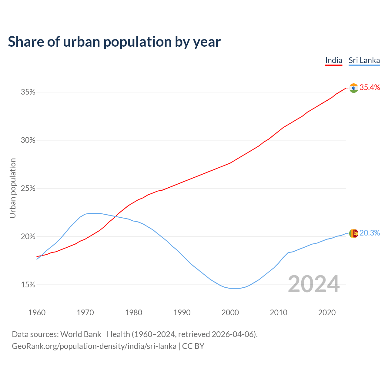 From 2004 to 2024, the share of urban population changed from 28.8% to 35.4% in India and from 14.9% to 20.3% in Sri Lanka.