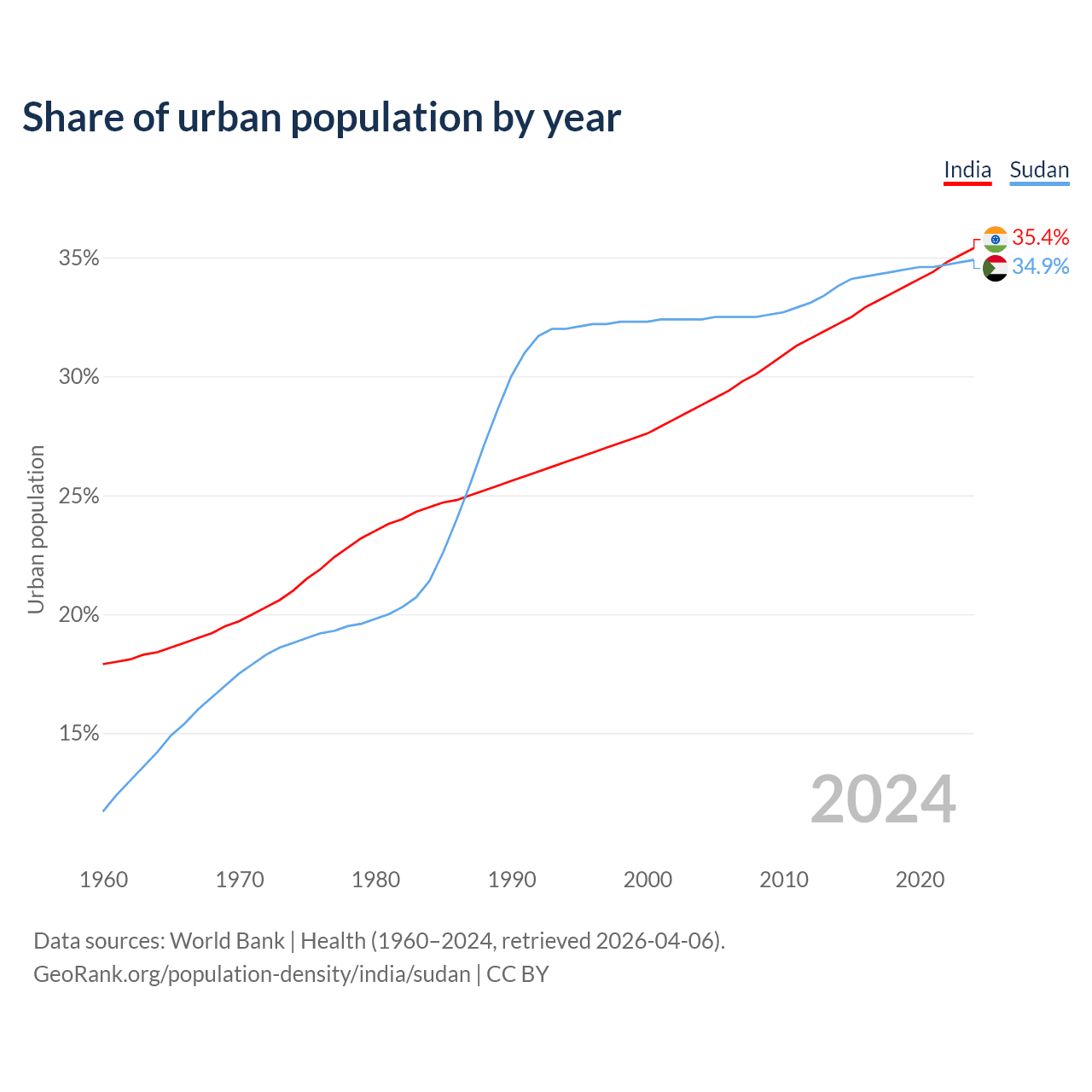 From 2004 to 2024, the share of urban population changed from 28.8% to 35.4% in India and from 32.4% to 34.9% in Sudan.