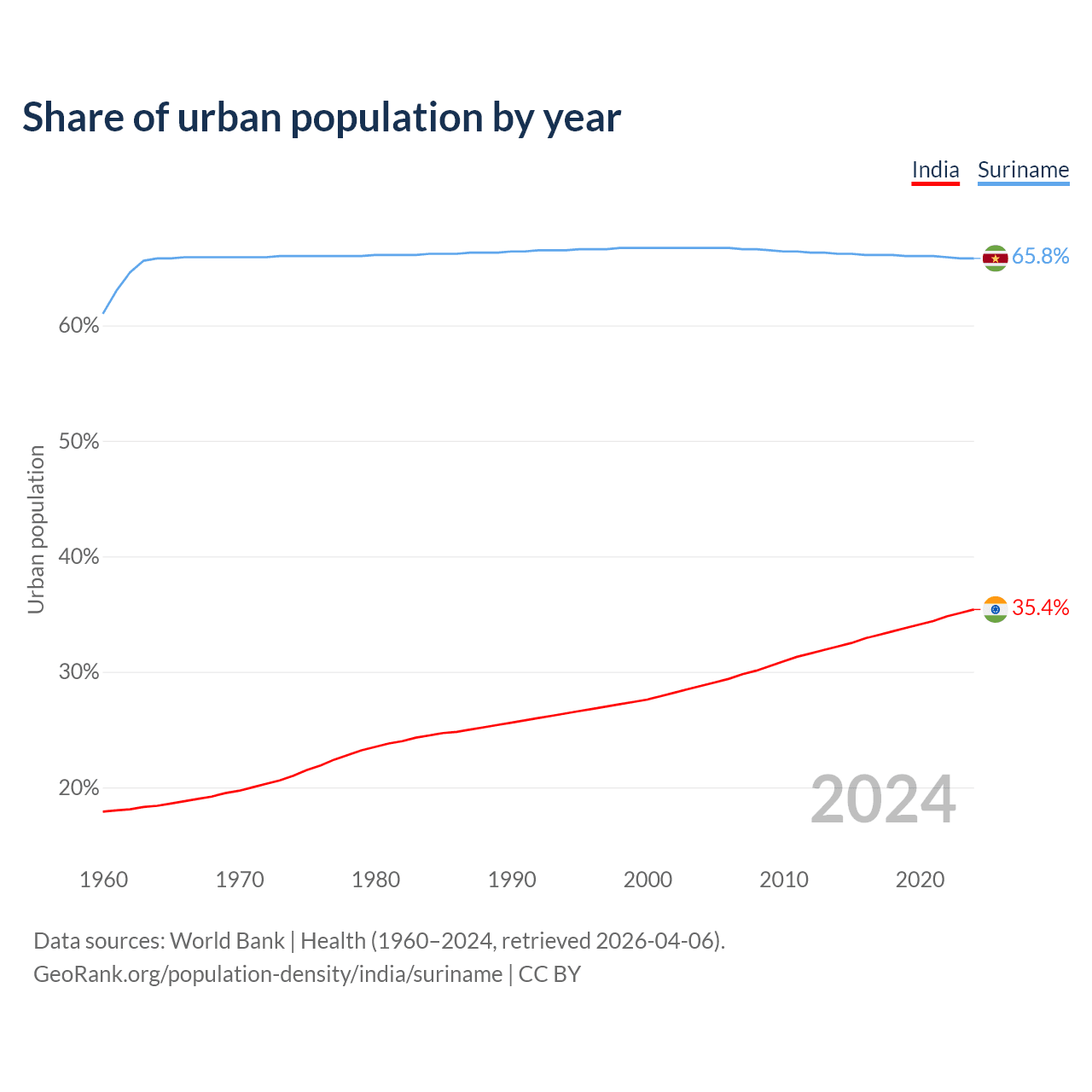 From 2004 to 2024, the share of urban population changed from 28.8% to 35.4% in India and from 66.7% to 65.8% in Suriname.