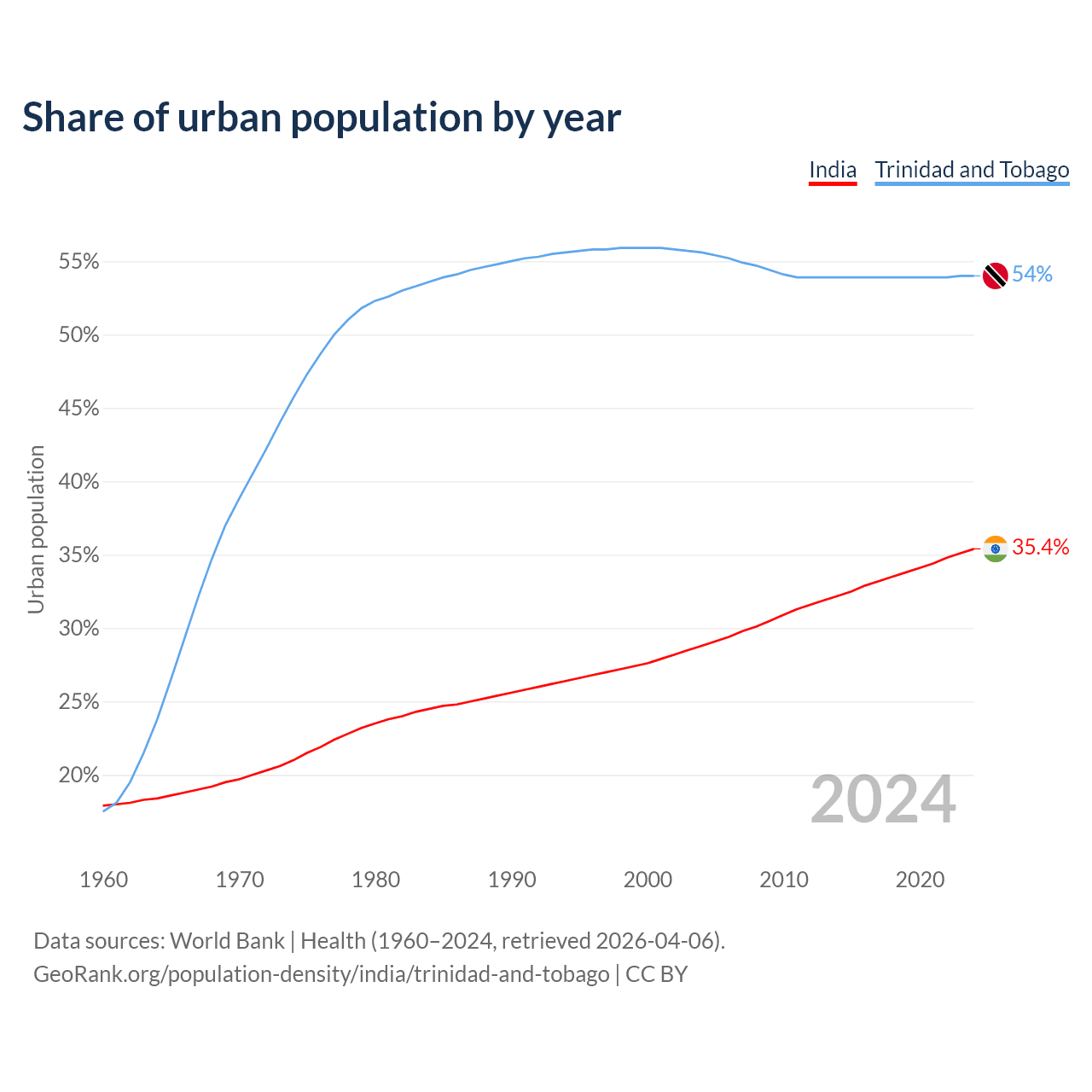 From 2004 to 2024, the share of urban population changed from 28.8% to 35.4% in India and from 55.6% to 54% in Trinidad and Tobago.