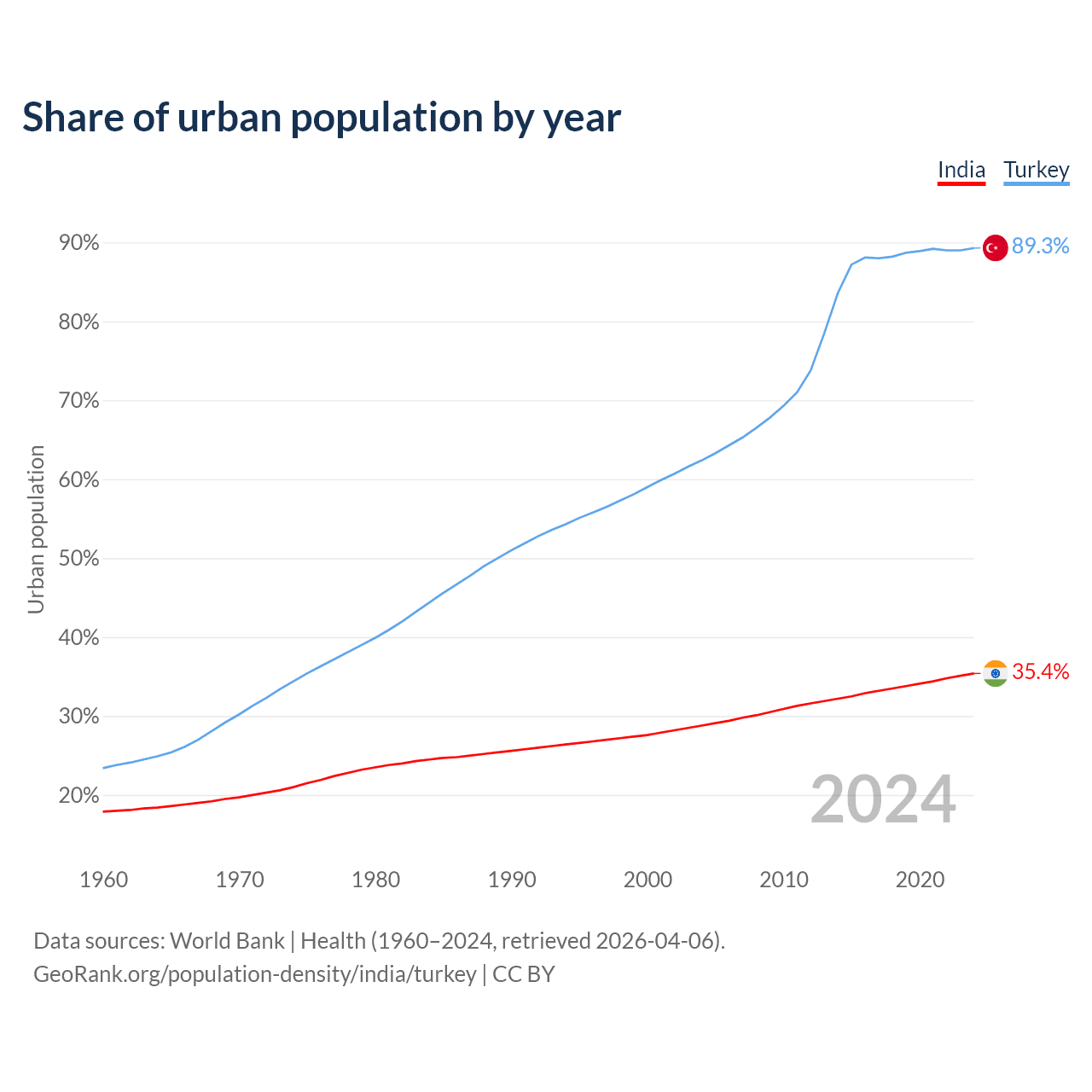 From 2004 to 2024, the share of urban population changed from 28.8% to 35.4% in India and from 62.4% to 89.3% in Turkey.