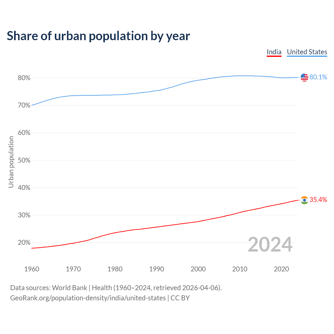 From 2004 to 2024, the share of urban population changed from 28.8% to 35.4% in India and from 80% to 80.1% in the United States.