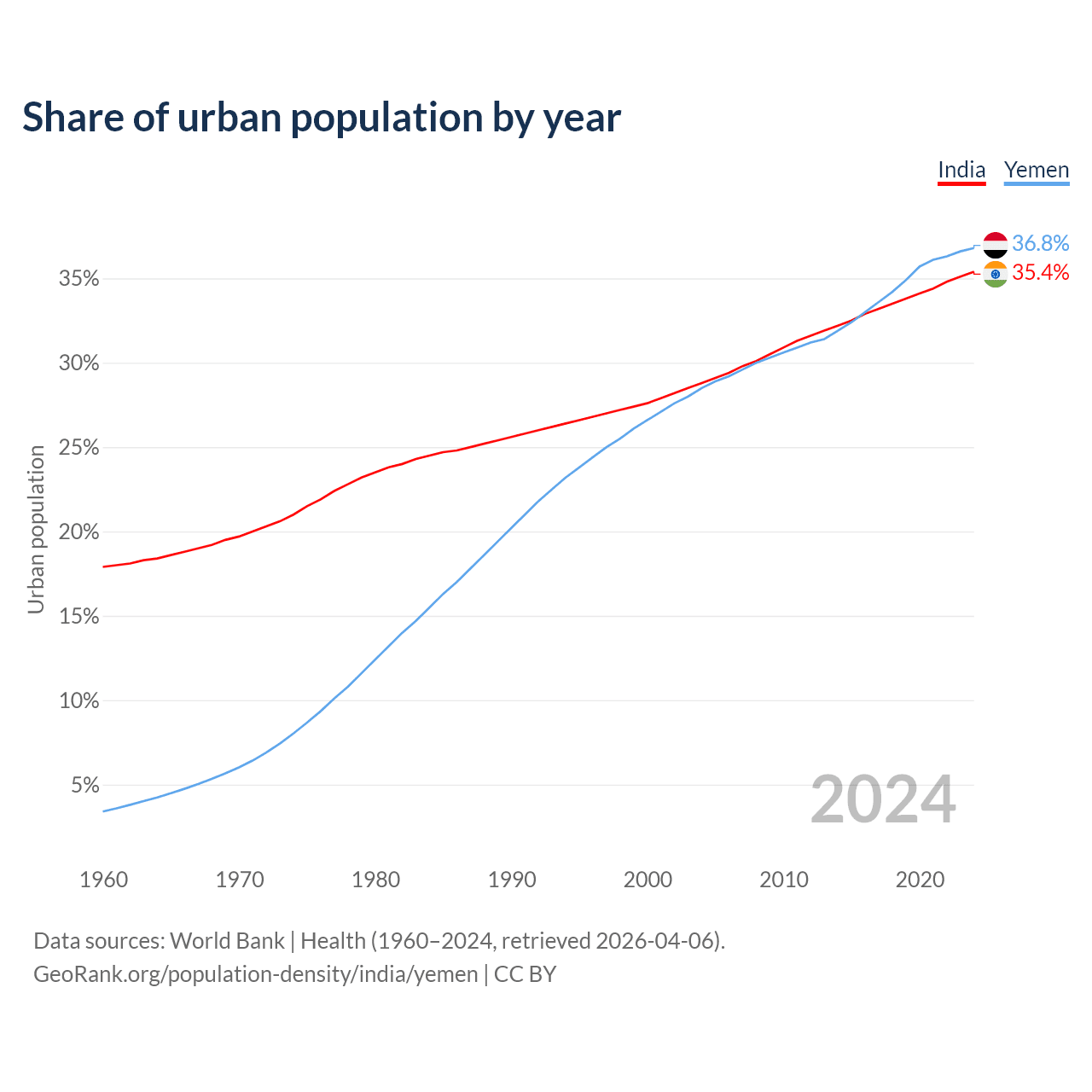 From 2004 to 2024, the share of urban population changed from 28.8% to 35.4% in India and from 28.5% to 36.8% in Yemen.
