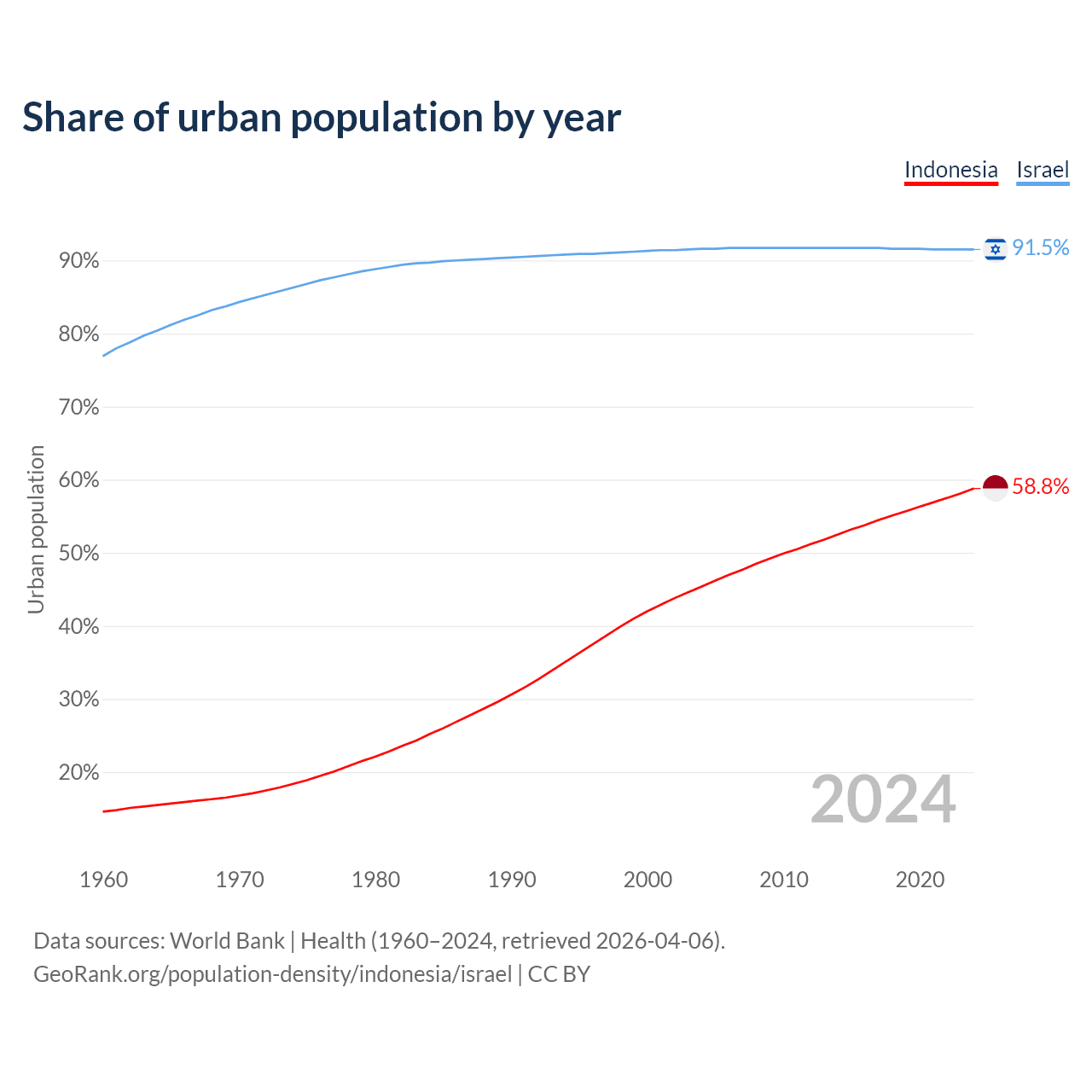 From 2004 to 2024, the share of urban population changed from 45.4% to 58.8% in Indonesia and from 91.6% to 91.5% in Israel.