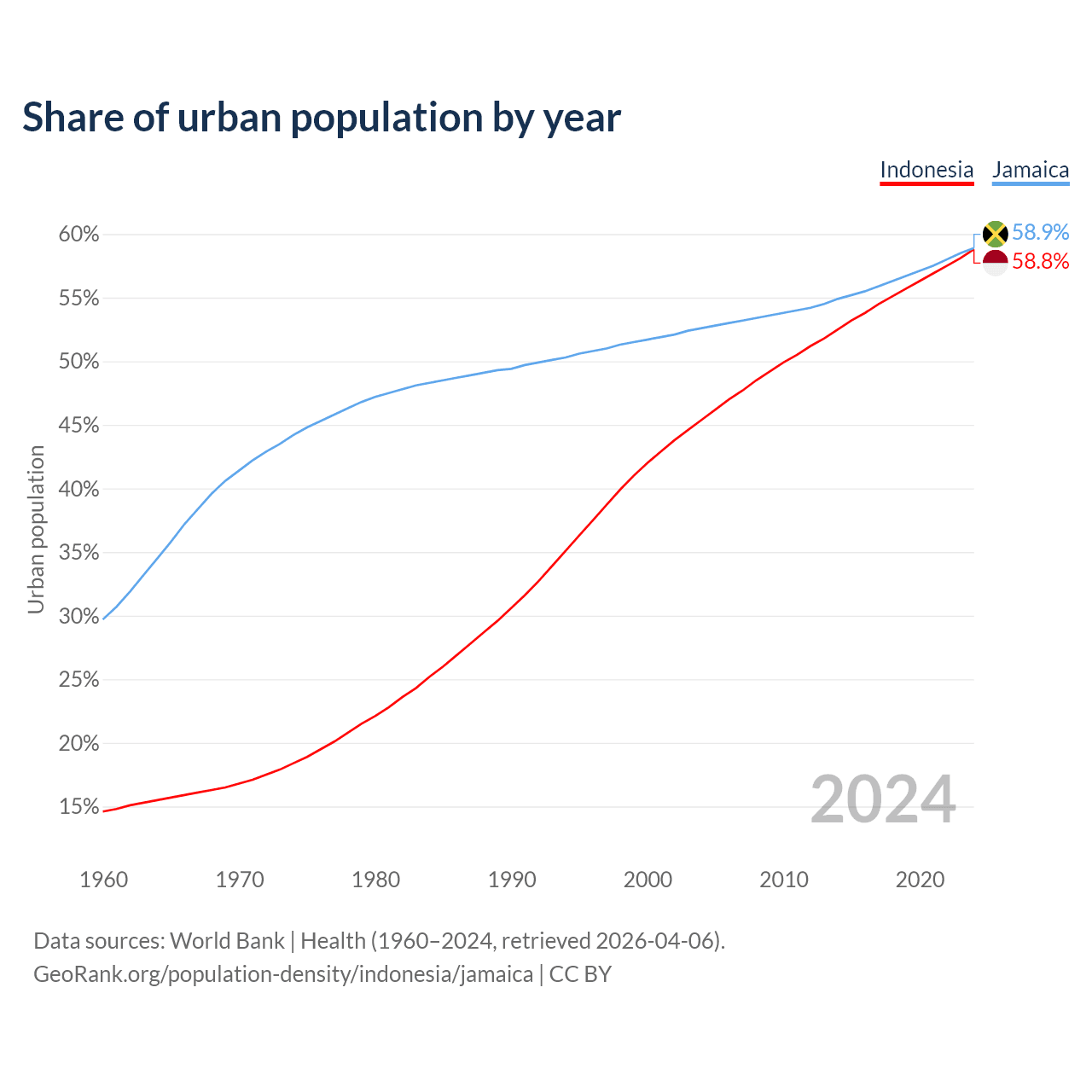 From 2004 to 2024, the share of urban population changed from 45.4% to 58.8% in Indonesia and from 52.6% to 58.9% in Jamaica.