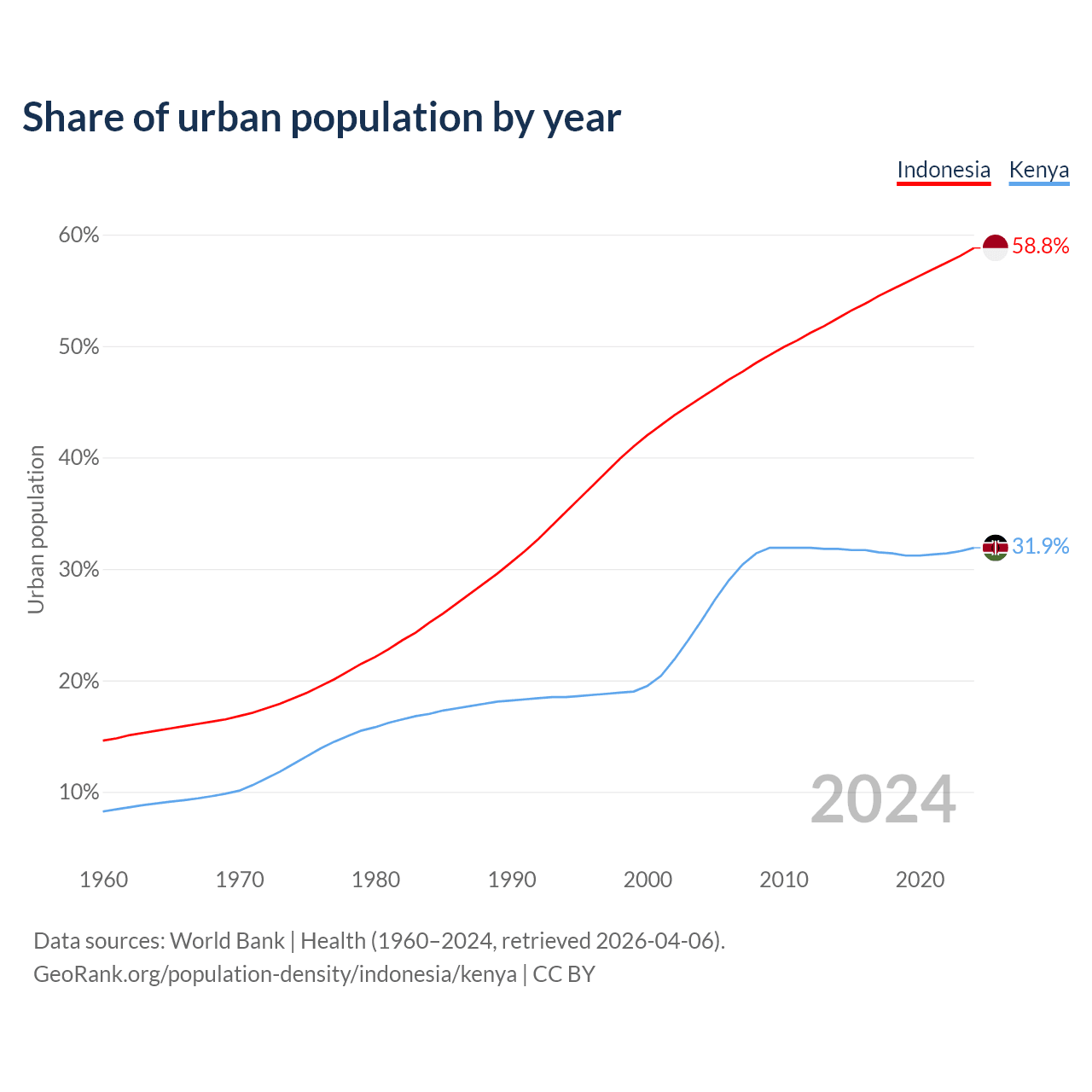 From 2004 to 2024, the share of urban population changed from 45.4% to 58.8% in Indonesia and from 25.4% to 31.9% in Kenya.