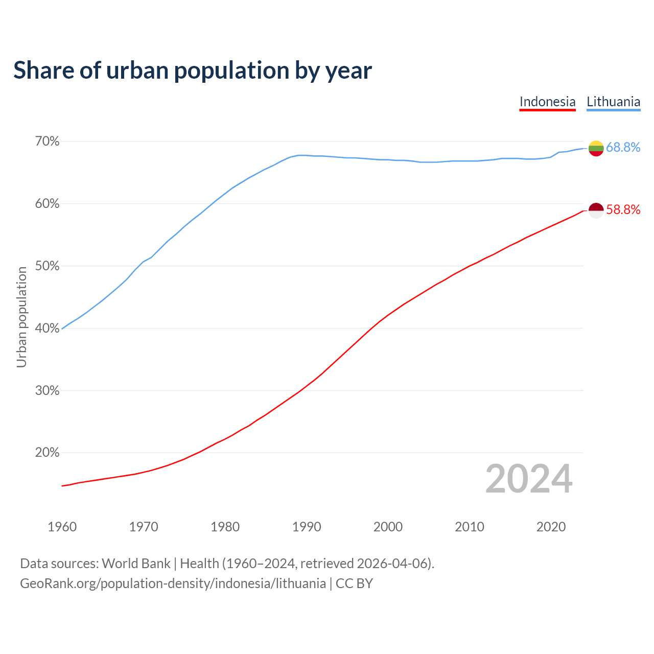 From 2004 to 2024, the share of urban population changed from 45.4% to 58.8% in Indonesia and from 66.6% to 68.8% in Lithuania.