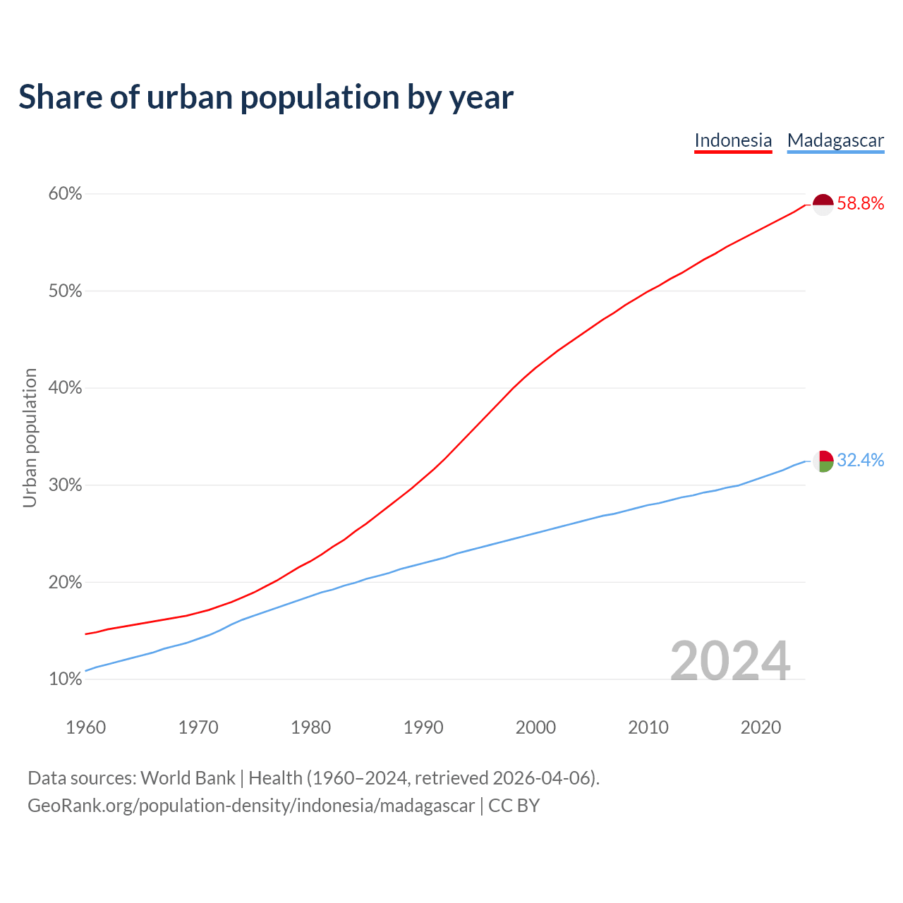 From 2004 to 2024, the share of urban population changed from 45.4% to 58.8% in Indonesia and from 26.2% to 32.4% in Madagascar.